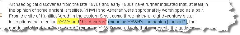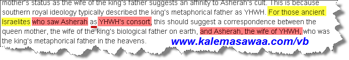بالنسبة لترجمة النقش فقد تحدّثنا بخصوصها بما فيه الكفاية ، إن شئتَ أفحمناك زيادة ! ![]() حفريات أجريت نهاية السبعينات وبداية الثمانينات تشير إلى أنّ العبرانيين الأوائل عبدوا يهوه و أشيرا كزوجين ، الكتابة التي عُثر عليها في شرق سيناء تشير إلى " يهوه و أشيراه " . " أشيراه" تعني : 1- زوجته CONSORT أو رفيقته : الإلهة THE GODESS أشيرا ، 2- سارية يهوه المقدّسة التي تمثّل الإلهة THE GODESS أشيراالجالسة داخل معبده وبجوار مذبحه . بالمناسبة الموقع ده يهودي .... ![]() http://jwa.org/encyclopedia/article/...hasherim-bible المزيد من مواضيعي