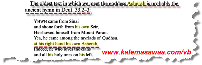 قد ينتفض النصراني قائلا : لا علمَ لي بنص يقول : " أقبل الرب من سيناء، وتألق من سعير، وأشرف من جبل فاران وعن يمينه أشيرا " ( نص تثنية 33 أعلاه ) نجيبه بحمد الله ،، لا عجب ...! سفر التثنية قد تعرض للتعديل ( edited ) -[ التحريف] - من طرف كتبة السّفر أو ال deuteronomist ، ![]() http://www.bibleinterp.com/articles/..._Asherah.shtml