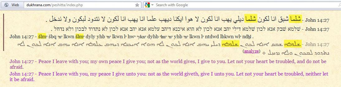 نقرأ من إنجيل يوحنا إصحاح 14 عدد 27 قولا منسوبا للسيد المسيح : أتْرُكُ لَكُمْ سَلاماً. أُعطِيْكُمْ سَلامِي أنا. لا أُعطِيْكُمْ سَلاماً كَالَّذِي يُعطِيْهِ العالَمُ. فَلا تَضطَرِبْ قُلُوبُكُمْ أوْ تَجبُنْ. و طبعا المسيح كان يتكلم الأرامية و نضع صورة للنص باللغة الأرامية من موقع www.dukhrana.com و الكلمة الأرامية المقابلة لكلمة سلاما هى كلمة شلما و هى قد تدل أيضا على الإسلام و الاستسلام و التسليم و الخضوع لله طبقا لما قاله رجال الدين المسيحي و طبقا للمعاجم الأرامية و هاهى أقوالهم بهدوء، ذلك السلام الذي هو تحت ووفقا لإرادة الله.. “Tranquility, that Peace which is under and in accordance to God’s Will.” [1] السلام الذي سبّب إخضاع أنفسهم لله.. “…the Peace which caused them to surrender themselves to God…” [2 أليس السلام الموافق لإرادة الله أو السلام المسبب لإخضاع نفس لله هو نفس معنى الإسلام لله عز و جل ؟ 1. Enlightenment From Aramaic, Selected Passages From The Khaboris Manuscripts, by Sadook De Mar Shimun, Archdeacon 2. New Testament Light, George M. Lamsa, Copyright © 1968 by Nina Shabaz, page 141 المزيد من مواضيعي