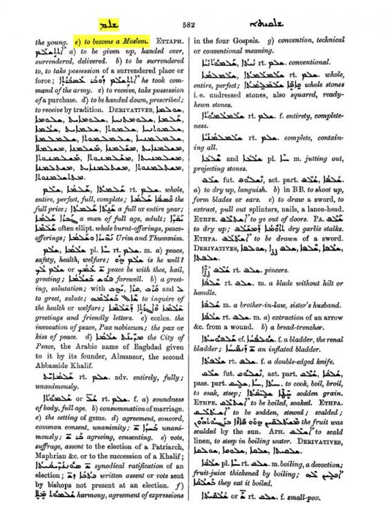 عموما نضع صور القواميس التى تثبت أن الإسلام و التسليم و الخضوع من معانى كلمة شلما الأرامية و مشتقاتها ننقل من قاموس A Compendious Syriac Dictionary by Robert Payne Smith 1903 و نرى أن من معانى الكلمة surrender أى يستسلم و become a muslim أى يصبح مسلما و نقرأ من قاموس Louis-Costaz's Syriac-French-English-Arabic Dictionary و يمكن تحميله من : http://archive.org/details/Syriac-French-English-Arabic-Dictionary و هنا نجد أن من معانى الكلمة to surrender أى يستسلم و نجد من معانيها كلمة مسلم مكتوبة بالحروف العربية المزيد من مواضيعي