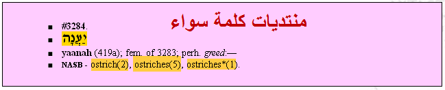 ![]() اللهم صل على محمد وعلى آله وصحبه أجمعين ،، لمن يـُنكر التحريف : نص أيوب 30 :29 الماسوري يتحدّث عن مخلوقين : אָח הָיִיתִי לְתַנִּים וְרֵעַ לִבְנוֹת יַעֲנָה 1- التنين : תַנִּים 2- النعام : יַעֲנָה ![]() بقدرة قادر ، تحول التنين إلى ذئب : فاندايك : صرت أخا للذئاب وصاحبا للنعام. و إلى إبن آوى أيضا : مشتركة : صرت أخا لبنات آوى رفيقا لطيور النعام وهنا نسأل النصراني ، ماعلاقة التنين بالذئب و إبن آوى ؟؟؟ أمّا فيما يلي و بقدرة قادر أيضا ، تحول النّعام إلى بوم ! ترجمة كينغ جيمس : I am a brother to dragons, and a companion to owls http://www.biblegateway.com/passage/...9&version=KJ21 الترجمة المبسّطة : صِرْتُ أخاً للِذِّئابِ، وَرَفِيقاً للِبُومِ. http://www.biblegateway.com/passage/...version=ERV-AR و هنا نسأل النصراني : ما علاقة النّعام بالبوم ؟؟؟ و إن لم يكن هذا تحريفا ، فماهو التحريف إذن ؟؟؟ دمتم بخير . للمزيد من مواضيعي