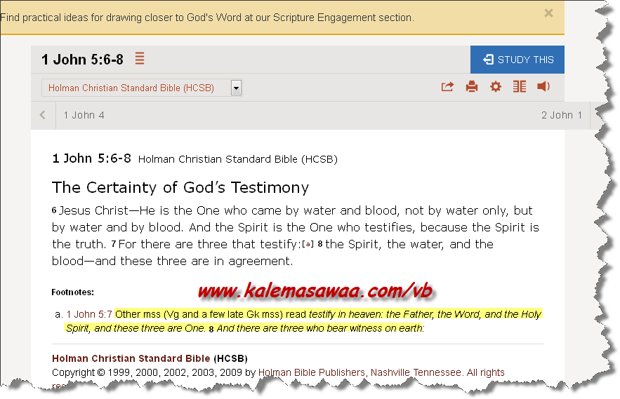 ![]() اللهم صل على محمد وعلى آله وصحبه أجمعين نقرأ من : رسالة يوحنا الأولى - الأصحاح 5 - سميث وفاندايك 7- فَإِنَّ الَّذِينَ يَشْهَدُونَ فِي السَّمَاءِ هُمْ ثَلاَثَةٌ: الآبُ، وَالْكَلِمَةُ، وَالرُّوحُ الْقُدُسُ. وَهَؤُلاَءِ الثَّلاَثَةُ هُمْ وَاحِدٌ. 8- وَالَّذِينَ يَشْهَدُونَ فِي الأَرْضِ هُمْ ثَلاَثَةٌ: الرُّوحُ، وَالْمَاءُ، وَالدَّمُ. وَالثَّلاَثَةُ هُمْ فِي الْوَاحِدِ رسالة يوحنا الأولى - الأصحاح 5 - حياة 7- فإن هنالك ثلاثة شهود في السماء، الآب والكلمة والروح القدس، وهؤلاء الثلاثة هم واحد 8- والذين يشهدون في الأرض هم ثلاثة: الروح، والماء، والدم. وهؤلاء الثلاثة هم في الواحد. رسالة يوحنا الأولى - الأصحاح 5 - أخبار سارة 7- والذين يشهدون هم ثلاثة. 8-الروح والماء والدم، وهؤلاء الثلاثة هم في الواحد. رسالة يوحنا الأولى - الأصحاح 5 - يسوعية 7- والذين يشهدون ثلاثة. 8- الروح والماء والدم وهؤلاء الثلاثة متفقون . كما يُلاحظ المتابع الكريم فترجمات اليسوعية و الساّرة قد حذفتا عبارة الآبُ، وَالْكَلِمَةُ، وَالرُّوحُ الْقُدُسُ. وَهَؤُلاَءِ الثَّلاَثَةُ هُمْ وَاحِدٌ ، و هي عبارة يتعلّق بها المنصّرون تعلّق الغريق بالطوق خلال محاولاتهم البائسة اليائسة لتدعيم فكر لاهوتي - إثبات ألوهية يسوع الملفّقة المزعومة - ![]() في السياق ذاته ، نقرأ من هامش ترجمة ال HCSB