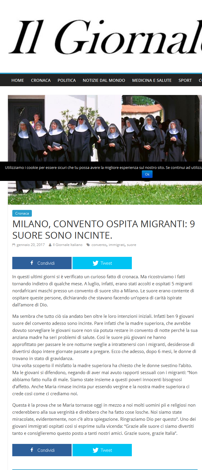 تنقل إلينا صحيفة '' إل جيورنالي إيطاليانو '' خبر إكتشاف كبيرة الراهبات في أحد الأديرة لحمل 9 ( تسعة ) راهبات بعد إستضافتهن ل 5 ( خمسة ) مهاجرين / لاجئين .
