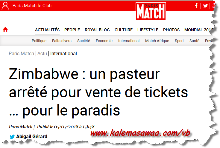 ![]() اللهم صل على محمد وعلى آله وصحبه أجمعين ،، نقلاً عن موقع صحيفة باري - ماتش الفرنسية : ![]() ![]() القس تيتو واتس كان يبيع تذاكر لدخول ( الملكوت ) الجنّة !!! ألقت شرطة زمبابوي القبض يومه 28 يونيو / حزيران على القس المدعو تيتو واتس و و جهت له تهمة الجريمة المالية . القس كان يطلب من مُريديه أمولاً مقابل منحهم تذاكر تفتح لهم أبواب المَلَكُوت !