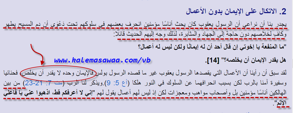 لقد سبق أن رأينا أن الأعمال التي يقصدها الرسول يعقوب غير ما قصده الرسول بولس.فالإيمان وحده لا يقدر أن يخلص، فحنانيا وسفيرة آمنا بالرب لكن بسبب انحرافهما عن السلوك في النور هلكا (أع 5: 9).ويذكر لنا الرب (مت 7: 21-23) من بين الهالكين أناسًا مؤمنين بل وأصحاب مواهب ومعجزات لكن إذ ليس لهم أعمال يقول لهم "إني لا أعرفكم قط، اذهبوا عني يا فاعلي الإثم".