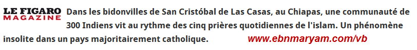![]() الحمدُ لله و الصّلاة و السّلام على رسول الله ،، الإسلام في بلاد المايا ينتشر إنتشار النّار في الهشيم ، الأجداد الوثنيون تمّ تنصيرهم بقوة الحديد و النّار على يد الغزاة الإسبان ( الكونكيستادورس ) هاهم الأحفاد اليوم يخرجون من عباءة الوثنية الجديدة - معتقد الصّليب و الخشبة - ليختاروا طواعية دين التّوحيد : الإسلام العظيم . نقرأ في مقال لجريدة "لوفيغارو" الفرنسية : في المناطق المحيطة بـ " سان كرسيتوبال دو لاس كاساس " تجمّع سكّاني يضم حوالي 300 فرد من الهنود يعيش على وقع الصّلوات الخمس . ظاهرة عجيبة في بلد ذي الأغلبية الكاثوليكية ( المكسيك ) . المصدر : lefigaro.fr ![]() ![]() ![]() ليبلغنّ هذا الدّين ما بلغ الليلُ و النّهار ولو رغمت أنوف ! ![]() دمتم سالمين . للمزيد من مواضيعي