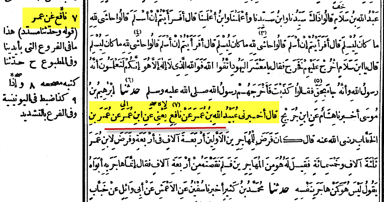 بسم الله الرحمن الرحيم الذي تطمئن اليه النفس في هذا الحديث _ والله اعلم _ ان ابن عمر قد سقط من الاسناد لاختلاف روايات الجامع الصحيح ... فكما هو معروف فان ابن حجر رحمه الله تعالى في شرحه لصحيح البخاري اعتمد على رواية ابي ذر الهروي ... ولم يكن يضع متن الحديث عند الشرح ... وانما اضافه محمد فؤاد عبد الباقي ولم ينتبه لاختلاف الروايات .... فلا شك ان الانقطاع في السند هو في رواية ابي ذر الهروي ... وإلا فالاسناد موجود كاملا بلا انقطاع في بقية الروايات مثل رواية المستملي والاصيلي وابي الوقت ... انظر الصورة للتوضيح وهي الطبعة السلطانية لصحيح البخاري ( طبعة بولاق) وهي اصح طبعة لصحيح البخاري في الدنيا ... ملاحظة: الصورة الثانية في المرفقات مرفوعة بالخطأ المزيد من مواضيعي