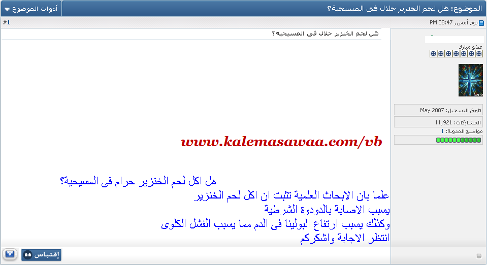 ![]() اللهم صل على محمد وعلى آله وصحبه أجمعين ، طرح أحد النصارى سؤالا يريد أن يعرف من خلاله حكم تناول لحم الخنزير حلال أم حرام هو في النصرانية : ![]() الجواب الأول : ![]() سنسلّم جدلا أنه لا سبب طبي يجعل النصارى يمتنعون عن لحم الخنزير ، لكن ماذا عن التعليم الكتابي ؟؟؟؟؟؟ ![]() الجواب الثاني : ![]() النصرانية أعلاه تبيح أكل لحم الخنزير و تسشهد بقولَي الربّ في أعمال 10: 13- وَصَارَ إِلَيْهِ صَوْتٌ:«قُمْ يَا بُطْرُسُ، اذْبَحْ وَكُلْ». 15 - فَصَارَ إِلَيْهِ أَيْضًا صَوْتٌ ثَانِيَةً:«مَا طَهَّرَهُ اللهُ لاَ تُدَنِّسْهُ أَنْتَ!» جميل جدا : مَا طَهَّرَهُ اللهُ لاَ تُدَنِّسْهُ أَنْتَ. ![]() لكن ما حكم ما جعله الله نجسا ؟؟؟؟ لحم الخنزير مثلا ؟؟؟ ![]() لاويين 11: 7 - وَالْخِنْزِيرَ، لأَنَّهُ يَشُقُّ ظِلْفًا وَيَقْسِمُهُ ظِلْفَيْنِ، لكِنَّهُ لاَ يَجْتَرُّ، فَهُوَ نَجِسٌ لَكُمْ 8- مِنْ لَحْمِهَا لاَ تَأْكُلُوا وَجُثَثَهَا لاَ تَلْمِسُوا. إِنَّهَا نَجِسَةٌ لَكُمْ. أشعياء 66 : 16 - لأَنَّ الرَّبَّ بِالنَّارِ يُعَاقِبُ وَبِسَيْفِهِ عَلَى كُلِّ بَشَرٍ، وَيَكْثُرُ قَتْلَى الرَّبِّ. 17- الَّذِينَ يُقَدِّسُونَ وَيُطَهِّرُونَ أَنْفُسَهُمْ فِي الْجَنَّاتِ وَرَاءَ وَاحِدٍ فِي الْوَسَطِ، آكِلِينَ لَحْمَ الْخِنْزِيرِوَالرِّجْسَ وَالْجُرَذَ، يَفْنَوْنَ مَعًا، يَقُولُ الرَّبُّ. ؟؟؟؟؟؟؟؟ !!!!!!!!! ![]() الأمر بتحريم لحم الخنزير واضح ، فهلا كففتم عن التلاعب بعقول السذّج .....! ![]() للمزيد من مواضيعي