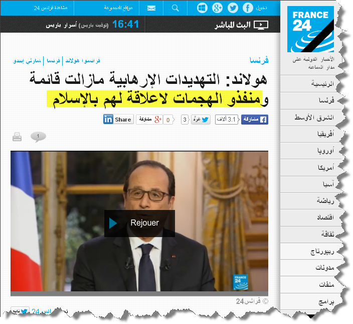 الرئيس الفرنسي فرانسوا هولاند يُلقم حجرا المنصّرين الذين وجدوا في الهجوم على صحيفة " شارلي إيبدو" مادّة دسمة لبثّ سمومهم و أحقادهم .