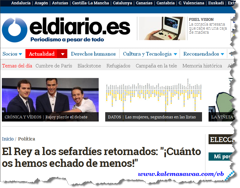 ![]() اللهم صل على محمد وعلى آله وصحبه أجمعين ،، ![]() " كم إشتقنا إليكم ، لأننا مواطنون إسبان سنسيرمعاً لبناء إسبانيا ذات مستقبل أفضل " عبارة ردّدها ملك إسبانيا فيليبي السادس خلال حفل تجنيس مجموعة من أحفاد اليهود الذين طُردوا من إسبانيا بعد سقوط الأندلس سنة 1492 ميلادي . المصدر : eldiario.es السؤال هو : متى سنسمع عبارة : كم إشتقنا إليكم مواطنينا أحفاد مسلمي الأندلس ( موريسكيون ) ؟؟؟ ![]() ملاحظة: المقطع أدناه به موسيقى ، يُرجى خفض الصّوت قليلاً . بارك الله فيكم . للمزيد من مواضيعي