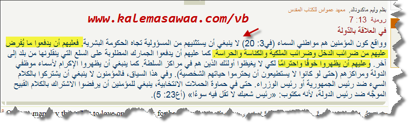 ![]() اللهم صل على محمد وعلى آله وصحبه أجمعين ،، نقرأ من رومية 13 : 7 فَأَعْطُوا الْجَمِيعَ حُقُوقَهُمُ: الْجِزْيَةَ لِمَنْ لَهُ الْجِزْيَةُ. الْجِبَايَةَ لِمَنْ لَهُ الْجِبَايَةُ. وَالْخَوْفَ لِمَنْ لَهُ الْخَوْفُ. وَالإِكْرَامَ لِمَنْ لَهُ الإِكْرَامُ. و من التفسير المًصاحب بقلم وليم ماكدونالد : ![]() من كتاب الدسقولية صفحة : 610 ، 611 نقرأ أيضاً : ![]() ![]() للمزيد من مواضيعي