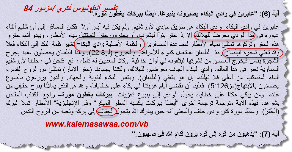نص مزمور 84 : 6 ترجمة يسوعية إذا مروا بوادي البلسان جعلوا منه ينابيع وباكورة الأمطار تغمرهم بالبركات. نص مزمور 84 : 6 ترجمة الأخبار السّارّة : يعبرون في وادي الجفاف،فيجعلونه عيون ماء، بل بركا يغمرها المطر. نص مزمور 84 : 6 ترجمة الحياة : وإذ يعبرون في وادي البكاء الجاف، يجعلونه ينابيع ماء، ويغمرهم المطر الخريفي بالبركات الكتاب المقدس يشهد على نفسه ! " وادي البـَكــَا " هو وادي شجر البلسان و هو وادي قاحل جاف ..! دليل جديد على أن المقصود ليس هو " وادي الرّفائين " الخصب . ![]() ![]() ![]()