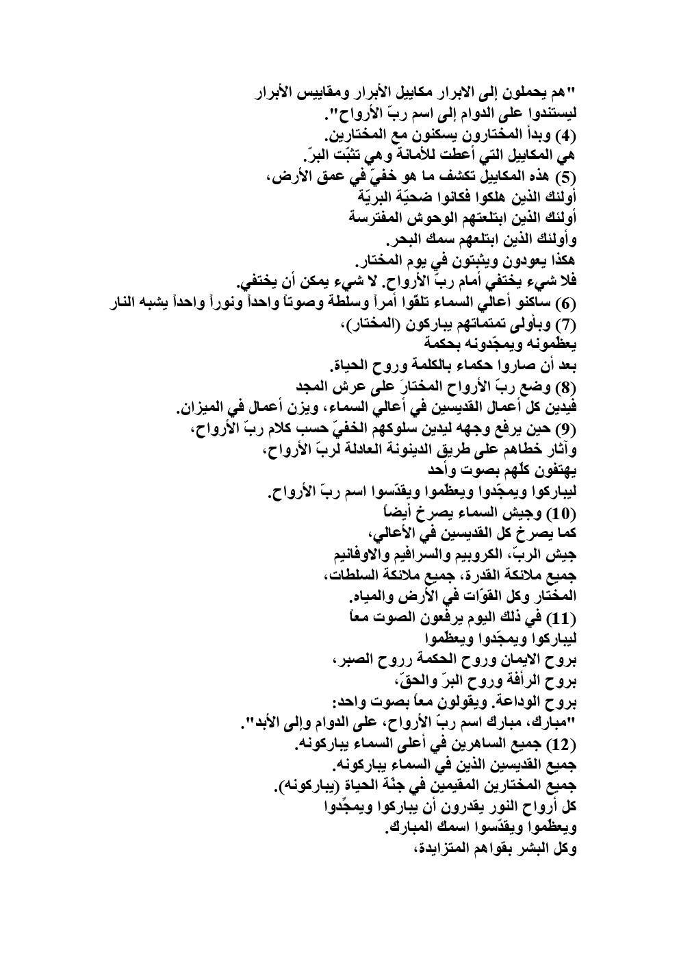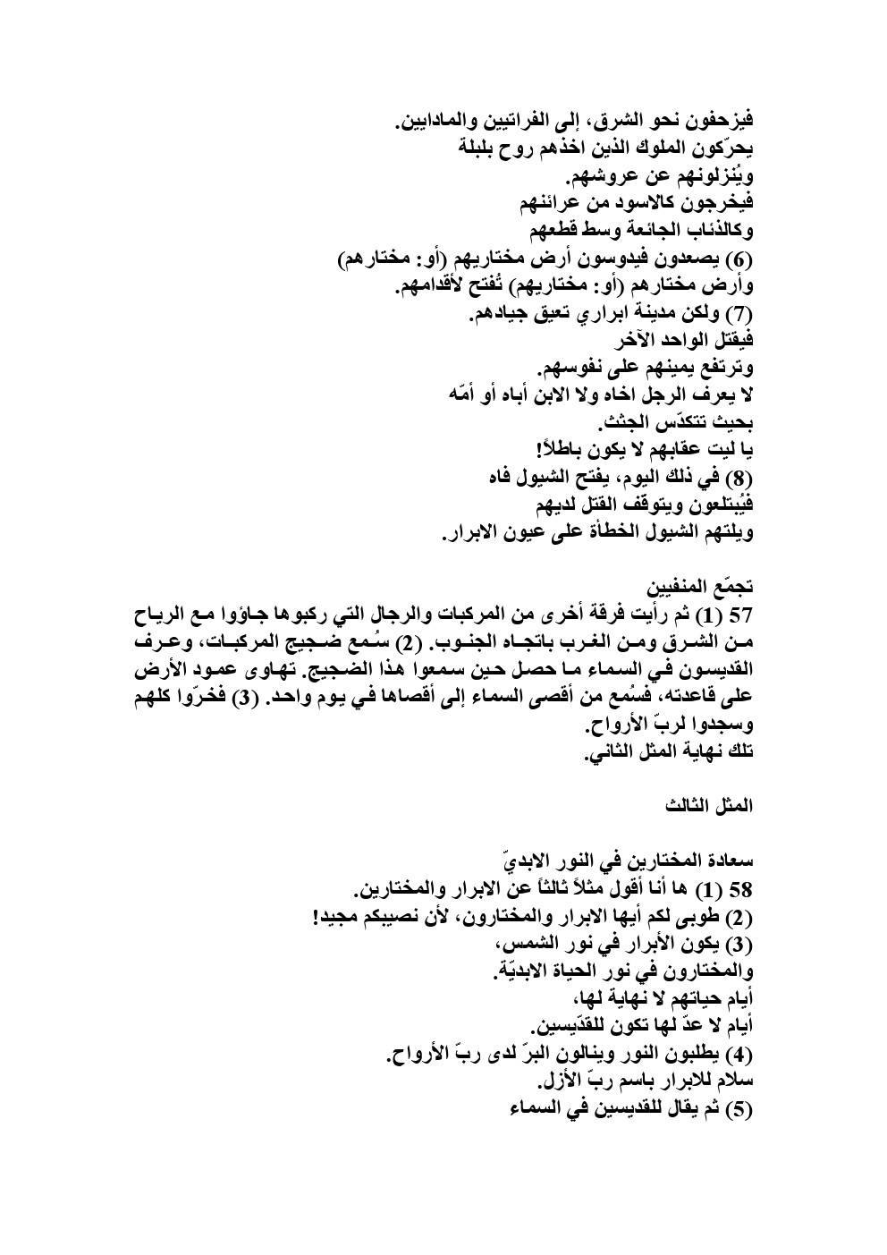 و ننتقل للفصل رقم 58 و هو يتحدث عن حال المؤمنين و نورهم يوم القيامة - نسأل الله تعالى أن يدخلنا فيهم برحمته - : نقرأ معا من الجملة الثالثة : يكون الأبرار فى نور الشمس و المختارون فى نور الحياة الأبدية أيام حياتهم لا نهاية لها أيام لا عد لها تكون للقديسين و نجد ذكر هذا النور فى كتاب الله عز و جل : ( يوم ترى المؤمنين والمؤمنات يسعى نورهم بين أيديهم وبأيمانهم بشراكم اليوم جنات تجري من تحتها الأنهار خالدين فيها ذلك هو الفوز العظيم) الحديد 12 و من الملفت للنظر أن الآية الكريمة تجمع بين الحديث عن نور المؤمنين يوم القيامة و خلودهم تماما كما فى العبارة السابقة من سفر أخنوخ و ننتقل للجملة الرابعة : يطلبون النور و ينالون البر لدى رب الأرواح سلام للأبرار باسم رب الأزل أما طلب المؤمنين للنور يوم القيامة فنجده أيضا فى كتاب الله عز و جل : ( يَوْمَ لا يُخْزِي اللهُ النَّبِيَّ وَالَّذِينَ آمَنُوا مَعَهُ نُورُهُمْ يَسْعَى بَيْنَ أَيْدِيِهمْ وَبِأَيْمَانِهِمْ يَقُولُونَ رَبَّنَا أَتَممْ لَنَا نُورَنَا وَاغْفِرْ لَنَا إِنَّكَ عَلَى كُلِّ شَيْءٍ قَدِيرٌ ) التحريم 8 فالنبي صلى الله عليه و سلم و الذين آمنوا معه يوم القيامة - نسأل الله أن يدخلنا فيهم بفضله و برحمته - يطلبون النور من الله يوم القيامة قائلين : ( ربنا أتمم لنا نورنا ). و أما ( سلام للأبرار باسم رب الأزل ) فنجدها أيضا فى موضعين من كتاب الله عز و جل : ( تحيتهم يوم يلقونه سلام ) الأحزاب 44 ( سلام قولا من رب رحيم ) يس 58 و جاء فى تفسير القرطبي للآية الكريمة السابقة من سورة يس أن الله تعالى يسلم على أهل الجنة : وروي من حديث جرير بن عبد الله البجلي أن رسول الله - صلى الله عليه وسلم - قال : بينا أهل الجنة في نعيمهم إذ سطع لهم نور فرفعوا رءوسهم فإذا الرب تعالى قد اطلع عليهم من فوقهم فقال : السلام عليكم يا أهل الجنة . فذلك قوله : سلام قولا من رب رحيم . فينظر إليهم وينظرون إليه ، فلا يلتفتون إلى شيء من النعيم ما داموا ينظرون إليه حتى يحتجب عنهم ، فيبقى نوره وبركاته عليهم في ديارهم ذكره الثعلبي والقشيري . المزيد من مواضيعي