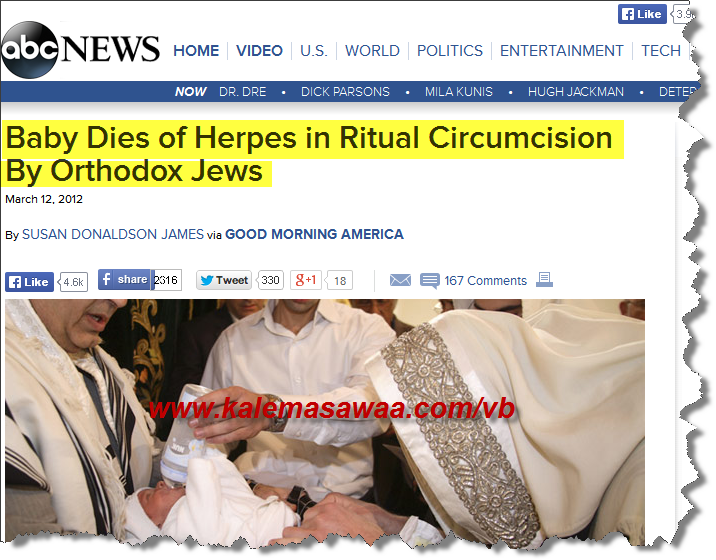 ![]() اللهم صل على محمد وعلى آله وصحبه أجمعين ،، كما هو معلوم فالختان عند اليهود هو تطبيق لواحدة من وصايا التّوراة: نقرأ في سفرالتكوين: 17: 10 هذا هو عهدي الذي تحفظونه بيني وبينكم وبين نسلك من بعدك.يختن منكم كل ذكر. 17: 11 فتختنون في لحم غرلتكم.فيكون علامة عهد بيني وبينكم. الغريب هو قيام المُشرف على طقس الختان بمصّ الدّم النّاتج عن قطع الغرلة ! ![]() ![]() الكارثة هو كون هذه الممارسة قد تتسبّب في نقل أمراض مُعدية ، كمرض Herpes الذي كان سببا في وفاة صبية يهود خضعوا لهذا الطّقس أثناء عملية الختان : ![]() أسفله مصدر الخبـــــر : abc news في أمان الله ،،، للمزيد من مواضيعي