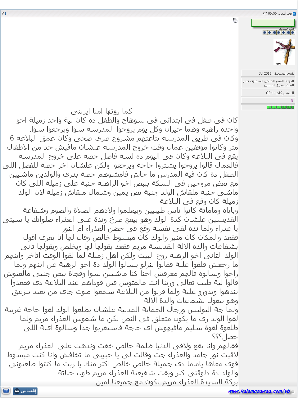 كان فى طفل فى ابتدائى فى سوهاج والطفل دة كان لية واحد زميلة اخو واحدة راهبة وهما جيران وكل يوم يروحوا المدرسة سوا ويرجعوا سوا.