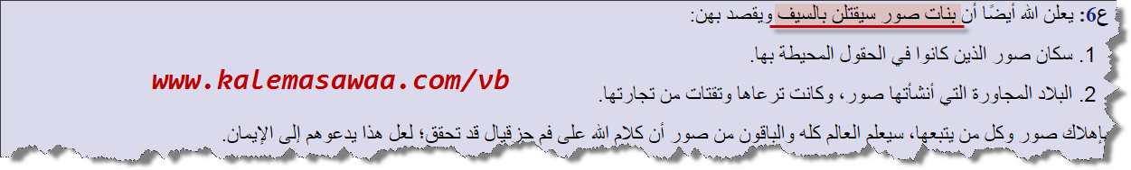 ![]() اللهم صل على محمد وعلى آله وصحبه أجمعين ،، قتل و إبادة نساء صور بأمر من يهوه / المصلوب يسوع : نقرأ من الهولي بايبل : حزقيال 26 : 1- 9 وَكَانَ فِي السَّنَةِ الْحَادِيَةِ عَشَرَةَ، فِي أَوَّلِ الشَّهْرِ، أَنَّ كَلاَمَ الرَّبِّ كَانَ إِلَيَّ قَائِلاً: يَا ابْنَ آدَمَ، مِنْ أَجْلِ أَنَّ صُورَ قَالَتْ عَلَى أُورُشَلِيمَ: هَهْ! قَدِ انْكَسَرَتْ مَصَارِيعُ الشُّعُوبِ. قَدْ تَحَوَّلَتْ إِلَيَّ. أَمْتَلِئُ إِذْ خَرِبَتْ. لِذلِكَ هكَذَا قَالَ السَّيِّدُ الرَّبُّ: هأَنَذَا عَلَيْكِ يَا صُورُ فَأُصْعِدُ عَلَيْكِ أُمَمًا كَثِيرَةً كَمَا يُعَلِّي الْبَحْرُ أَمْوَاجَهُ. فَيَخْرِبُونَ أَسْوَارَ صُورَ وَيَهْدِمُونَ أَبْرَاجَهَا. وَأَسْحِي تُرَابَهَا عَنْهَا وَأُصَيِّرُهَا ضِحَّ الصَّخْرِ، فَتَصِيرُ مَبْسَطًا لِلشِّبَاكِ فِي وَسْطِ الْبَحْرِ، لأَنِّي أَنَا تَكَلَّمْتُ، يَقُولُ السَّيِّدُ الرَّبُّ. وَتَكُونُ غَنِيمَةً لِلأُمَمِ. وَبَنَاتُهَا اللَّوَاتِي فِي الْحَقْلِ تُقْتَلُ بِالسَّيْفِ، فَيَعْلَمُونَ أَنِّي أَنَا الرَّبُّ. « لأَنَّهُ هكَذَا قَالَ السَّيِّدُ الرَّبُّ: هأَنَذَا أَجْلِبُ عَلَى صُورَ نَبُوخَذْرَاصَّرَ مَلِكَ بَابِلَ مِنَ الشِّمَالِ، مَلِكَ الْمُلُوكِ، بِخَيْل وَبِمَرْكَبَاتٍ وَبِفُرْسَانٍ وَجَمَاعَةٍ وَشَعْبٍ كَثِيرٍ، فَيَقْتُلُ بَنَاتِكِ فِي الْحَقْلِ بِالسَّيْفِ، وَيَبْنِي عَلَيْكِ مَعَاقِلَ، وَيَبْنِي عَلَيْكِ بُرْجًا، وَيُقِيمُ عَلَيْكِ مِتْرَسَةً، وَيَرْفَعُ عَلَيْكِ تُرْسًا،وَيَجْعَلُ مَجَانِقَ عَلَى أَسْوَارِكِ، وَيَهْدِمُ أَبْرَاجَكِ بِأَدَوَاتِ حَرْبِهِ. من التفاسير المسيحية نقرأ: ![]()