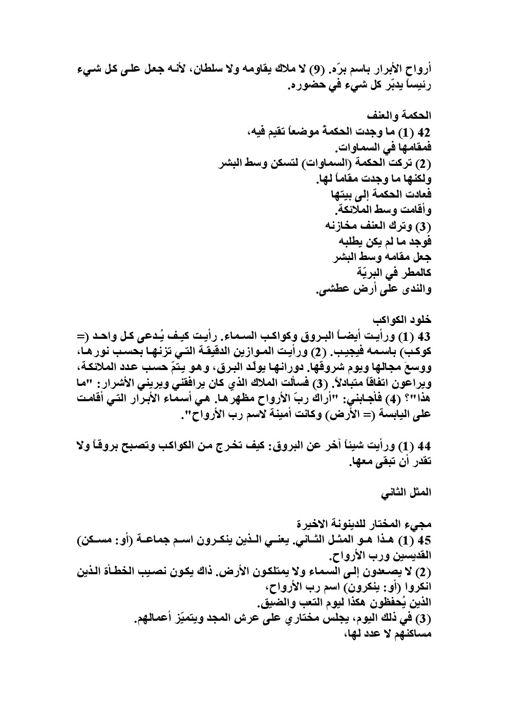 و ننتقل للفصل التالى مباشرة من سفر أخنوخ و هو يتحدث عن مختار البر و الحق أى النبي صلى الله عليه و سلم و عن الأبرار و منازلهم فى الآخرة و مرافقتهم للقديسين و الملائكة و نعرض النصوص و لنقرأ من آخر الصفحة الأولى تحت عنوان ( رأى أخنوخ سعادة الأبرار و مختار البر) حتى عنوان (أخنوخ و الملائكة يباركون الرب) فى الصفحة الثانية و فى الجملة الخامسة نقرأ ( هناك رأيت بعينى أنهم يقيمون مع ملائكة البر و يرتاحون فى رفقة القديسين) أما إقامتهم مع ملائكة البر فهى ما أخبرنا الله تعالى عنه فى القرآن الكريم فى سورة الرعد: ( الذين يوفون بعهد الله ولا ينقضون الميثاق ( 20 ) والذين يصلون ما أمر الله به أن يوصل ويخشون ربهم ويخافون سوء الحساب ( 21 ) والذين صبروا ابتغاء وجه ربهم وأقاموا الصلاة وأنفقوا مما رزقناهم سرا وعلانية ويدرءون بالحسنة السيئة أولئك لهم عقبى الدار ( 22 ) جنات عدن يدخلونها ومن صلح من آبائهم وأزواجهم وذرياتهم والملائكة يدخلون عليهم من كل باب( 23 ) سلام عليكم بما صبرتم فنعم عقبى الدار ( 24 ) ) فالأبرار مقيمون مع الملائكة و الملائكة تدخل عليهم من كل باب لتحييهم و تهنئهم بدخول الجنة أما رفقة القديسين فالقديسون هم بلا شك النبيون و الصديقون و الشهداء و الله عز و جل يقول : (وَمَنْ يُطِعِ اللَّهَ وَالرَّسُولَ فَأُولَٰئِكَ مَعَ الَّذِينَ أَنْعَمَ اللَّهُ عَلَيْهِمْ مِنَ النَّبِيِّينَ وَالصِّدِّيقِينَ وَالشُّهَدَاءِ وَالصَّالِحِينَ ۚ وَحَسُنَ أُولَٰئِكَ رَفِيقًا) النساء 69 أما الجملة التى تقول : ( هم يصلون يتوسلون يتضرعون من أجل البشر) فهى تنطبق على الملائكة و المؤمنين فأما الملائكة فهى تدعو للمؤمنين بنص القرآن الكريم فى سورة غافر: ( الذين يحملون العرش ومن حوله يسبحون بحمد ربهم ويؤمنون به ويستغفرون للذين آمنوا ربنا وسعت كل شيء رحمة وعلما فاغفر للذين تابوا واتبعوا سبيلك وقهم عذاب الجحيم ( 7 ) ربنا وأدخلهم جنات عدن التي وعدتهم ومن صلح من آبائهم وأزواجهم وذرياتهم إنك أنت العزيز الحكيم ( 8 ) وقهم السيئات ومن تق السيئات يومئذ فقد رحمته وذلك هو الفوز العظيم ( 9 ) ) و أما المؤمنون و الأبرار فيشفعهم الله فى أهل النار يوم القيامة - إذا خَلَصَ المؤمنُونَ مِنَ النارِ وأَمِنُوا ؛ ف [ والذي نَفسي بيدِهِ ! ] ما مُجَادَلَةُ أَحَدِكُمْ لِصاحِبِه في الحَقِّ يكونُ لهُ في الدنيا بِأَشَدَّ من مُجَادَلَةِ المؤمنينَ لِرَبِّهِمْ في إِخْوَانِهِمُ الذينَ أُدْخِلوا النارَ . قال : يقولونَ : رَبَّنا ! إِخْوَانُنا كَانُوا يُصَلُّونَ مَعَنا ، ويَصُومُونَ مَعَنا ، ويَحُجُّونَ مَعَنا ، [ ويجاهدونَ مَعَنا ] ، فَأَدْخَلْتَهُمُ النارَ . قال : فيقولُ : اذْهَبُوا فَأَخْرِجُوا مَنْ عَرَفْتُمْ مِنْهُمْ ، فيأتونَهُمْ ، فَيَعْرِفُونَهُمْ بِصُوَرِهِمْ ، لا تَأْكُلُ النارُ صُوَرَهُمْ ، [ لمْ تغشَ الوجهُ ] ، فَمِنْهُمْ مَنْ أَخَذَتْهُ النارُ إلى أنْصافِ ساقيْهِ ، ومِنْهُمْ مَنْ أَخَذَتْهُ إلى كَعْبَيْهِ [ فيخرجَونَ مِنْها بشرًا كثيرًا ] ، فَيقولونَ : رَبَّنا ! قد أَخْرَجْنا مَنْ أَمَرْتَنا . قال : ثُمَّ [ يعودونَ فيتكلمونَ ف ] يقولُ : أَخْرِجُوا مَنْ كان في قلبِهِ مثقال دينارٍ مِنَ الإيمانِ . [ فيخرجَونَ خلقًا كثيرًا ] ، ثُمَّ [ يقولونَ : رَبَّنا ! لمْ نَذَرْ فيها أحدًا مِمَّنْ أَمَرْتَنا . ثُمَّ يقولُ : ارْجِعُوا ، ف ] مَنْ كان في قلبِهِ وزْنُ نصفِ دِينارٍ [ فأخَرَجَوهُ . فيخرجَونَ خلقًا كثيرًا ، ثُمَّ يقولونَ : رَبَّنا ! لمْ نَذَرْ فيها مِمَّنْ أَمَرْتَنا . . . ] ، حتى يقولَ : أخَرَجُوا من كان في قُلْبِه مثقال ذرةٍ . [ فيخرجَونَ خلقًا كثيرًا ] ، قال أبو سعيدٍ : فمَنْ لمْ يُصَدِّقْ بهِذا الحَدِيثِ فليَقرأْ هذه الآيَةَ : إِنَّ اللَّهَ لَا يَظْلِمُ مِثْقَالَ ذَرَّةٍ وَإِنْ تَكُ حسنةً يُضَاعِفْهَا وَيُؤْتِ مِنْ لَدُنْهُ أَجْرًا عَظِيمًا [ النساء / 40 ] ، قال : فَيقولونَ : رَبَّنا ! قد أَخْرَجْنا مَنْ أَمَرْتَنا ، فلمْ يَبْقَ في النارِ أحدٌ فيهِ خيرٌ . قال : ث