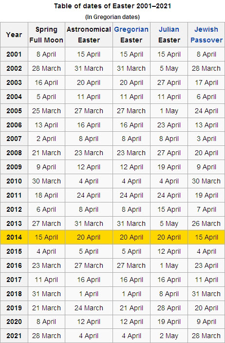 * من المعلوم - كما هو مذكور - أن: الفصح الاورثوذكسي يختلف عن الكنائس الكاثوليكية والبروستناتية ، اعتمادا على حساب مختلف. كما هو مبين بالجدول التالي [*]: