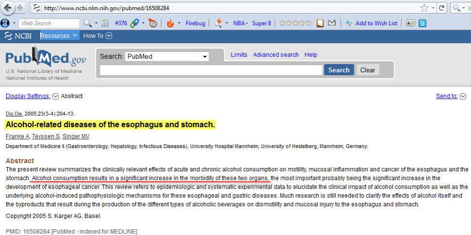 فهذا بحث ألماني من موقع الـ Pubmed للأبحاث الطبية عن أضرار شرب الخمر على المعدة والمريء