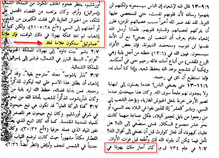 ثانياً :- هذه تلفيقه من متى ليس إلا مت 1 :22 - 23 وَهذَا كُلُّهُ كَانَ لِكَيْ يَتِمَّ مَا قِيلَ مِنَ الرَّبِّ بِالنَّبِيِّ الْقَائِلِ:«هُوَذَا الْعَذْرَاءُ تَحْبَلُ وَتَلِدُ ابْنًا، وَيَدْعُونَ اسْمَهُ عِمَّانُوئِيلَ» الَّذِي تَفْسِيرُهُ: اَللهُ مَعَنَا. إذاً نعود لنرى النبى القائل ماذا قال :- و حدث في ايام احاز بن يوثام بن عزيا ملك يهوذا ان رصين ملك ارام صعد مع فقح بن رمليا ملك اسرائيل الى اورشليم لمحاربتها فلم يقدر ان يحاربها و اخبر بيت داود و قيل له قد حلت ارام في افرايم فرجف قلبه و قلوب شعبه كرجفان شجر الوعر قدام الريح فقال الرب لاشعياء اخرج لملاقاة احاز انت و شارياشوب ابنك الى طرف قناة البركة العليا الى سكة حقل القصار و قل له احترز و اهدا لا تخف و لا يضعف قلبك من اجل ذنبي هاتين الشعلتين المدخنتين بحمو غضب رصين و ارام و ابن رمليا لان ارام تامرت عليك بشر مع افرايم و ابن رمليا قائلة نصعد على يهوذا و نقوضها و نستفتحها لانفسنا و نملك في وسطها ملكا ابن طبئيل هكذا يقول السيد الرب لا تقوم لا تكون لان راس ارام دمشق و راس دمشق رصين و في مدة خمس و ستين سنة ينكسر افرايم حتى لا يكون شعبا و راس افرايم السامرة و راس السامرة ابن رمليا ان لم تؤمنوا فلا تامنوا ثم عاد الرب فكلم احاز قائلا اطلب لنفسك اية من الرب الهك عمق طلبك او رفعه الى فوق فقال احاز لا اطلب و لا اجرب الرب فقال اسمعوا يا بيت داود هل هو قليل عليكم ان تضجروا الناس حتى تضجروا الهي ايضا و لكن يعطيكم السيد نفسه اية ها العذراء تحبل و تلد ابنا و تدعو اسمه عمانوئيل (إش 7 : 1 - 14) هنا نلاحظ أن قلب آحاز ملك يهوذا ارتجف لأن دولتي إسرائيل وسوريا (ارام) تآمرتا عليه وعلى دولته ، وكان الرب الإله مع آحاز ، وأمر الربُ إشعياءَ أن يذهب هو وابنه شَآرَ يَاشُوبَ ويُطَمْئِن آحاز ملك يهوذا ، ووعده الرب أنه في مدة لا تزيد عن 65 سنة تكون حلت الهزيمة بدولتي إسرائيل وسوريا (ارام) ، وقد أعطاه الله علامة على اقتراب تحقق النصر، وهي أن تحبل سيدة منهم بولد فتسميه "عمانوئيل" . فهل المدة بين إشعياء و المسيح 65 سنة ؟! أم أن متى لم يستطع فبركة النبوءة و تفصيلها على مقاس المسيح ؟! و تعترف الترجمة اليسوعية : " أن إشعياء يشير مباشرة إلى ولادة ابن لآحاز " ![]() غير أنهم عادوا ليُهموا القارىء أن النبوءة عن المسيح معتمدين على اسم عمانوئيل مدعين أن له هيبة و قوة ، و سوف نرى بأنفسنا اسم أكثر قوة من اسم عمانوئيل - بحسب فكرهم فى اسم عمانوئيل - فى نهاية الرد . كما إعترفوا أن الكلمة العبرانية فى الأصل العبرى : " يدل إما على صبية أو على إمرأة لم يمض زمن طويل على زواجها " و ليس على عذراء .كما أن العذراء كانت مخطوبة ، حين حملت بالمسيح - عليه السلام - و لم تكن متزوجة و لم يمض على زواجها زمن طويل . مت 1 : 18 أَمَّا وِلاَدَةُ يَسُوعَ الْمَسِيحِ فَكَانَتْ هكَذَا: لَمَّا كَانَتْ مَرْيَمُ أُمُّهُ مَخْطُوبَةً لِيُوسُفَ، قَبْلَ أَنْ يَجْتَمِعَا، وُجِدَتْ حُبْلَى مِنَ الرُّوحِ الْقُدُسِ [ص:1540] كما قال القس منيس عبد النور فى (شبهات وهمية) :- [ص:93] [ص:161] [كتاب الأصول] لابن جناح اليهودى [ عمود : 529 ] الرجل يؤكد أن الكلمة تأتى بمعنى بكر أو غير بكر ، و إستشهد على ذلك بأسفار آخرى (سفر الأمثال) فالكلمة لا تدل على عذراء كما يدعى النصارى ، بل إن الرجل كان يُحاجج النصارى بذلك و يرفض ترجمة النصارى للكلمة بالبكر (عذراء) . [ عمود : 530 ] ثالثاً :- هل (الله معنا) تُعنى أنه (الله) ؟! فهناك (طوبيا) و التى تُعنى (الله طيب) ، فهل هذا يُعنى أن طوبيا هو الله ؟! غير ما فى هذا الاسم (الله طيب) من قوة أكثر من اسم (الله معنا) . فأيهما أقوى :- عندما يقول عمانوئيل معرفاً نفسه (أنا الله معنا) أم عندما يقول طوبيا معرفاً نفسه (أنا الله طيب) ؟ ففى هذا رد على زعم أصحاب الترجمة اليسوعية ، ناهيك عن كون النص يتحدث عن صبية أو إمرأة حديثة الزواج و ليس عن عذراء . رابعاً :- لنكمل النص . زبدا و عسلا ياكل متى عرف ان يرفض الشر و يختار الخير لانه قبل ان يعرف الصبي ان يرفض الشر و يختار