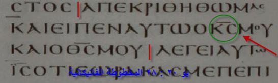 العجيب أن النصرانى يستشهد بكلام علماءه ، لكن حينما نستشهد نحن بهذا الكلام يضرب به عرض الحائط ، فلم يلتفت لكلام الدكتور "وهيب جورجى" ، و كأنه كلامى أنا ! حسناً ! لنرجع إلى اللغة الأصلية التى كُتِبَ بها العهد الجديد (اليونانية) لنرى من الرابط التالى كلمة (رب أو سيد) ، و أعذرونا أننا سنسير نقطة نقطة ، لكون النصرانى لا يعلم عن الكلمة شيئاً فى أصولها اليونانية كما سيتضح لكم . http://concordances.org/greek/2962.htm هذه هى الكلمة (κύριος) و الأحوال المختلفة التى سنراها فيها حسب موقعها من الجملة . الآن أيها القارىء الكريم صاحب العقل و التمييز و ليس النصرانى الذى أكتب رداً على كلامه ، فهو لا يقرأ من الأساس كما هو واضح للجميع أو بالأحرى يهرب من مداخلاتى ... نأخذ مجموعة من النصوص التى يستشهد بها النصرانى فى أصولها اليونانية . يقول المسيح – عليه السلام - : "ليس كل من يقول لي: يا رب ، يا رب ! يدخل ملكوت السماوات. بل الذي يفعل إرادة أبي الذي في السماوات"(مت 7 : 21) Nestle-Aland NOVUM TESTAMENTUM MAT-7-21: ου πας ο λεγων μοι κυριε κυριε εισελευσεται εις την βασιλειαν των ουρανων αλλ ο ποιων το θελημα του πατρος μου του εν τοις ουρανοις قبل أن نرى النص من المخطوطات لنقارن بينه و بين غيره كما سنرى بعد قليل ، ننظر لهذا الجدول الذى يظهر منه إختصار (κύριος) فى المخطوطات . و الآن مع المخطوطات ، البداية بالمخطوطة السينائية :- المخطوطة الفاتيكانية :- النص الثانى هو قول توما : "أجاب توما وقال لهم :ربي وإلهي!"(يو 20 : 28) و رغم كون ترجمة الفاندايك تضع علامة تعجب ، لكننا سنساير من يستشهد بهذا النص على أن المسيح – عليه السلام – هو المقصود من كلام توما . Greek NT: Tischendorf 8th Edition JOH-20-28: ἀπεκρίθη Θωμᾶς καὶ εἶπεν αὐτῷ· ὁ κύριός μου καὶ ὁ θεός μου النص فى المخطوطة السينائية :- النص فى المخطوطة الفاتيكانية :- نكتفى بهذه الأمثلة ممن قالوا للمسيح - عليه السلام - (κύριος) و ننتقل إلى آخرين قيل لهم كلمة (κύριος) و قبل الإنتقال إلى هذه الأمثلة أحب الإشارة إلى أن النص الأخير جاءت فيه الكلمة (κύριος) مُعرفة بــ (ὁ) ، و لاحظوا أداة التعريف من الرابط التالى :- http://concordances.org/greek/3588.htm و هذا التنبيه فقط لكون النصرانى يُصر على إقحام اللغة العربية فى الموضوع و القول بأن كلمة (κύριος) التى يترجمونها (رب) لا تأتى معرفة سوى لله ، فيقول :