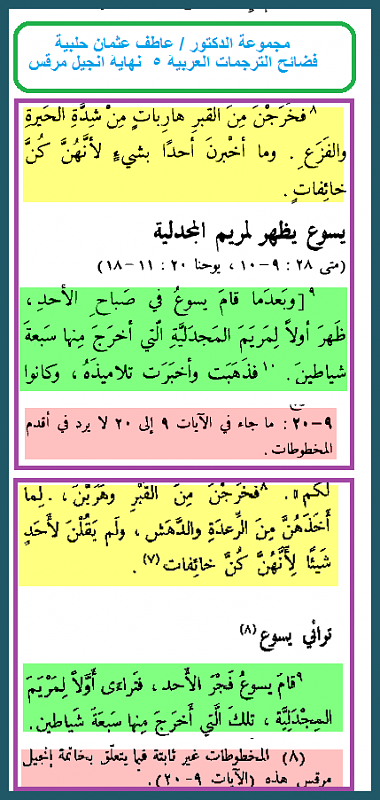 مشكلةالمشكلات : تقسيم الترجمات العربية 1- في كتابي ( اطلس تحليل مخطوطات العهد الجديد – الجزء الاول ) تناولت مشكلة نهاية مرقس في المخطوطات بعنوان ( توب فايف – 1 ) فليراجع 2- الان سنري كيف تناولت الترجمات العربية تلك المعضلة أ- الترجمات عن النص اليوناني : 1- هذه صورة توضح 3 صفحات متتالية تمثل خاتمة انجيل مرقس من كتاب ( العهد الجديدي بين السطور ) وهي النص اليوناني للعهد الجديد نقلا عن ( نستل – الان ، الطبعة 27 ) ( العهد الجديد اليوناني – الطبعة الرابعة) كما هو في مقدمة الكتاب 2- يتضح من الصورة ، هناك نص باللون الاصفر ( مرقس 16-4 الي 16-8 ) ونص باللون الاخضر (مرقس 16-9 الي 16-20 ) ونص باللون الازرق موجود في المتن وليس موجود في الهامش ، وملاحظة باللون الازرق مكتوب فيها ( وضعنا النص القصير ) 3- ماذا يعني ذلك ؟ هناك 3 نهايات لانجيل مرقس ، أ- لانهاية (ينتهي الانجيل عند العدد 16-8) وهي الموضحة في المتن والهامش باللون الاصفر ب-نهاية قصيرة (باللون الازرق في المتن وليست في الهامش ) ت- نهاية طويلة (مرقس 16-9 الي 16-20) باللون الاخضر في المتن والهامش 4- اذن اول خلاف في نهاية مرقس في هذه الترجمة عن النص اليوناني هو وجود النهاية القصيرة في المتن وحذفها من الهامش 5- وهذه صورة لستة ترجمات اخري عربية نقلا عن النص اليوناني ولا يوجد بها الزيادة الموجودة في النص اليوناني الانجيل بين السطور