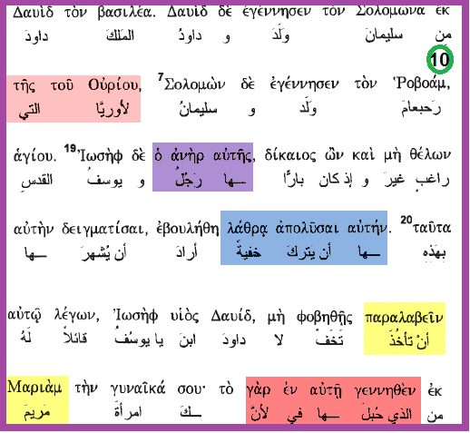 هنا يتفق النصان اليونانيان وتختلف الترجمة في النسختين العربيتين ، في خمسة الفاظ سنوضحها من كتاب العهد الجديد بين السطور باعتباره ترجمة حرفية لنص نستل والان كما في الصورة رقم 10 وهي كالاتي : اولا : (ارملة اوريا – التي كانت لاوريا ) 1- الكلمة اليونانية في النصين باللون الاحمر الفاتح ، وكما هي في العهد الجديد بين السطور (التي لاوريا) كما في الترجمة القديمة ، فلماذا غيرتها الترجمة الحديثة في الطبعة الثالثة الي ارملة اوريا ؟ ربما انها استقبحت قصة داود مع امرأة اوريا ؟ 2- فقد وردت القصة في العهد القديم في سفر صموئيل الثاني كالاتي : 11: 1 و كان عند تمام السنة في وقت خروج الملوك ان داود ارسل يواب و عبيده معه و جميع اسرائيل فاخربوا بني عمون و حاصروا ربة و اما داود فاقام في اورشليم 11: 2 و كان في وقت المساء ان داود قام عن سريره و تمشى على سطح بيت الملك فراى من على السطح امراة تستحم و كانت المراة جميلة المنظر جدا 11: 3 فارسل داود و سال عن المراة فقال واحد اليست هذه بثشبع بنت اليعام امراة اوريا الحثي 11: 4 فارسل داود رسلا و اخذها فدخلت اليه فاضطجع معها و هي مطهرة من طمثها ثم رجعت الى بيتها 11: 5 و حبلت المراة فارسلت و اخبرت داود و قالت اني حبلى 11: 15 و كتب في المكتوب يقول اجعلوا اوريا في وجه الحرب الشديدة و ارجعوا من ورائه فيضرب و يموت 11: 26 فلما سمعت امراة اوريا انه قد مات اوريا رجلها ندبت بعلها 11: 27 و لما مضت المناحة ارسل داود و ضمها الى بيته و صارت له امراة و ولدت له ابنا و اما الامر الذي فعله داود فقبح في عيني الرب 12: 19 و راى داود عبيده يتناجون ففطن داود ان الولد قد مات فقال داود لعبيده هل مات الولد فقالوا مات (انتهي) 3- فالقصة تدل علي ان داود زني بامرأة اوريا وانجب منها ولد ، ولكنه تزوجها بعد موت اوريا وانجب منها سليمان ،وبذلك يكون فعلا ان داود انجب سليمان من ارملة اوريا 4- ولكن النص يقول حرفيا ( من التي لاوريا ) والترجمة الحديثة ليست دقيقة وهذه ثلاثة عشر ترجمة عربية اخري لايوجد بها سوي واحدة تؤيد الطبعة الثالثة كما في الصورة رقم 11 المزيد من مواضيعي