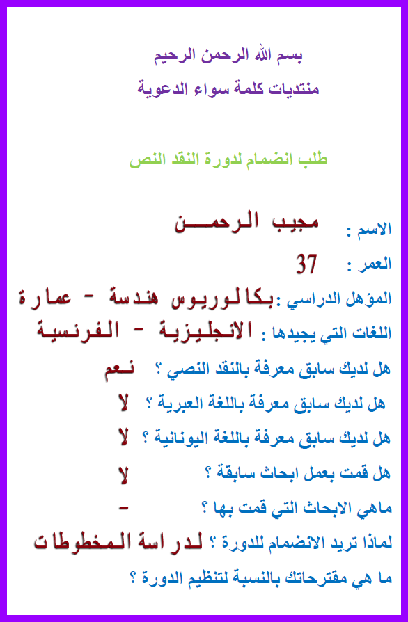 الاسم / حسين مهدى العمر/ 37 سنه المؤهل الدراسى / دبلوم صناعى الغات / العربيه هل لديك سابق معرفه بالنقد النصى لا هل لديك سابق معرفه باللغه العبريه لا هل لديك سابق معرفه باللغه اليونانيه لا هل قمت بعمل ابحث سابقه لا لماذا تريد الانضمام للدوره لنصره الدين ما هى مقترحاتك بالنسبه لتنظيم الدوره ان تكون الدراسه لكل فرع على حده لعدم التشتيت وان يكون هناك تواصل صوتى مع المحاضر |