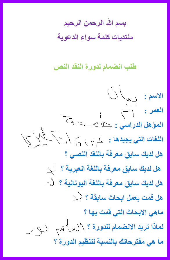 السلام عليكم ورحمة الله وبركاته هذه بياناتى الشخصية المطلوبة للدورة : 1_الاسم : أبو عبد الله بلال بن المنذر 2_السن :25 3_المؤهل الدراسي: الماجستير في انظمة المعلومات والبرمجيات 4_اللغات : العربية , الانجليزية , الفرنسية 5_هل لديك سابق معرفة بالنقد النصي: لا 6_هل لديك سابق معرفة باللغة العبرية : لا 7_هل لديك سابق معرفة باللغة اليونانية: لا 8_هل قمت بعمل أبحاث سابقة: لا 9_لما انضم الى هذه الدورة : انضم الى الدورة كى اكون على بصيرة بما ادعوا اليه ولأنتفع بما اتعلم وانفع غيرى به 10_ المقترحات للتنظيم : ان تكون دروس الدورة متوفرة بالفيديو |