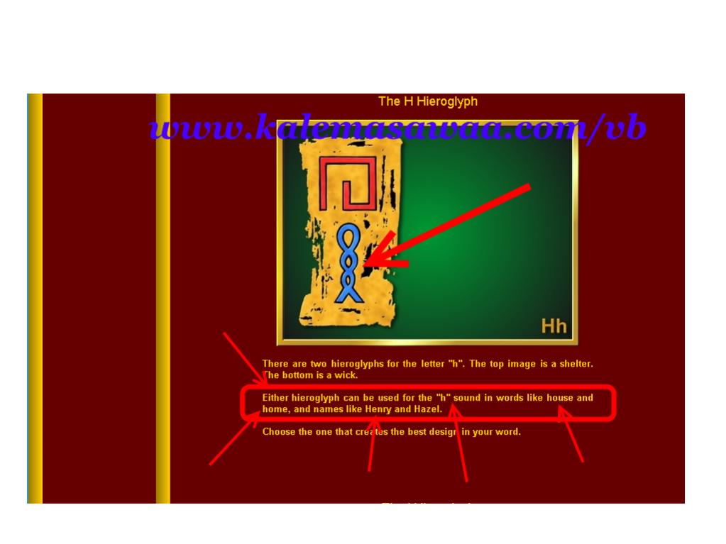 http://www.artyfactory.com/egyptian_...yphs_G-H-I.htm دليل آخر على كون منطوق رمز الحبل الملفوف " هــــــــ " ( الهــــــاء في الانجليزية مثلا ) : he - who ![]() http://www.docstoc.com/docs/109601893/The-Hieroglyphic-Phonetic -Alphabet يُتبع ...... |