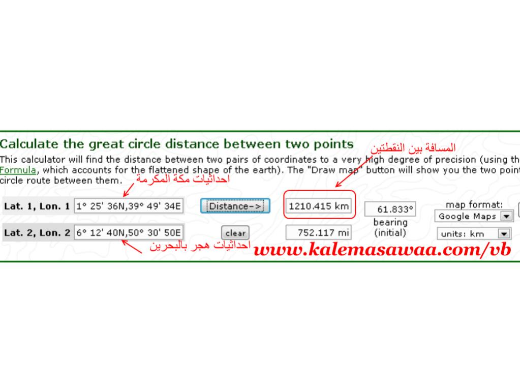 صورة من جوجل ستلايت لهجر بدولة البحرين : فضلا أنقر هــُنا قمتُ أخي الكريم بحساب المسافة باستعمال احداثيات ال جي .بي .اس GPS وكانت النتائج كالتالي : احداثيات مكة: Latitude : 21° 25' 36N Longitude: 39° 49' 34E احداثيات هجر بالبحرين : Latitude : 26° 12' 40N Longitude : 50° 30' 50E احداثيات بصرى بسورية : Latitude : 32° 31' 0N Longitude : 36° 28' 60E موقع احداثيات ال جي بي اس هو : http://www.fallingrain.com/world موقع حساب المسافات بين نقطتين تبعا لاحداثيات الجي بي اس : http://www.gpsvisualizer.com/calculators الأن مع النتائج : المسافة بين مكة و هجر : 1210 كيلومتر ![]() المسافة بين مكة وبصرى : 1272 كيلومتر ![]() يعني الفرق : 62 كيلومتر . ![]() المسافة بالميل : المسافة بين مكة و هجر : 752 ميل . المسافة بين مكة وبصرى : 790 ميل . يعني الفرق : 38 ميل ملحوظة : الاختلاف البسيط بين المسافتين مرجعه الى اختلاف الاحداثيات من منطقة لأخرى . مثال : احداثيات مركز مكة ليست هي نفسها احداثيات أطراف مكة ،، نفس الشئء بالنسبة لهجر و بصرى . موضوع ذو صلة : https://www.kalemasawaa.com/vb/t15023.html#post133220 المزيد من مواضيعي