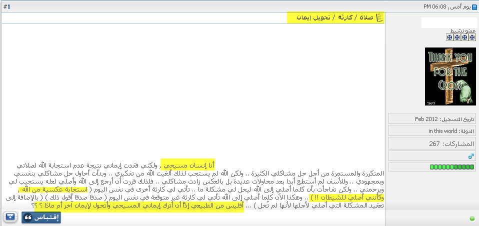 السلام عليكم ورحمة الله وبركاته اللهم صل على محمد وعلى آله وصحبه أجمعين اليكم شهادة نصراني بلغ به الفراغ الروحي الى درجة اليأس الشديد لأن يقول : " و كأنني أصلي للشيطان " " ولكن الله لم يستجب لذلكَ ألغيت الله من تفكيري " و يعقب النصراني متسائلا : " أفليس من الطبيعي أن أترك ايماني المسيحي و أبحث عن ايمان آخر؟؟؟ " نُجيبه ،،، عين الصّواب ستفعل !!!! ![]() للمزيد من مواضيعي