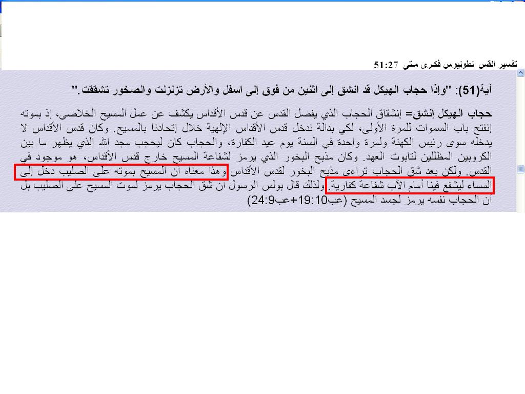 "وهذا معناه أن المسيح بموته على الصليب دخل الى السماء ليشفع فينا أمام الآب شفاعة كفارية"