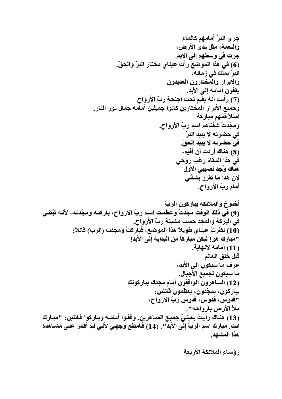 و ننتقل للفصل التالى مباشرة من سفر أخنوخ و هو يتحدث عن مختار البر و الحق أى النبي صلى الله عليه و سلم و عن الأبرار و منازلهم فى الآخرة و مرافقتهم للقديسين و الملائكة و نعرض النصوص و لنقرأ من آخر الصفحة الأولى تحت عنوان ( رأى أخنوخ سعادة الأبرار و مختار البر) حتى عنوان (أخنوخ و الملائكة يباركون الرب) فى الصفحة الثانية و فى الجملة الخامسة نقرأ ( هناك رأيت بعينى أنهم يقيمون مع ملائكة البر و يرتاحون فى رفقة القديسين) أما إقامتهم مع ملائكة البر فهى ما أخبرنا الله تعالى عنه فى القرآن الكريم فى سورة الرعد: ( الذين يوفون بعهد الله ولا ينقضون الميثاق ( 20 ) والذين يصلون ما أمر الله به أن يوصل ويخشون ربهم ويخافون سوء الحساب ( 21 ) والذين صبروا ابتغاء وجه ربهم وأقاموا الصلاة وأنفقوا مما رزقناهم سرا وعلانية ويدرءون بالحسنة السيئة أولئك لهم عقبى الدار ( 22 ) جنات عدن يدخلونها ومن صلح من آبائهم وأزواجهم وذرياتهم والملائكة يدخلون عليهم من كل باب( 23 ) سلام عليكم بما صبرتم فنعم عقبى الدار ( 24 ) ) فالأبرار مقيمون مع الملائكة و الملائكة تدخل عليهم من كل باب لتحييهم و تهنئهم بدخول الجنة أما رفقة القديسين فالقديسون هم بلا شك النبيون و الصديقون و الشهداء و الله عز و جل يقول : (وَمَنْ يُطِعِ اللَّهَ وَالرَّسُولَ فَأُولَٰئِكَ مَعَ الَّذِينَ أَنْعَمَ اللَّهُ عَلَيْهِمْ مِنَ النَّبِيِّينَ وَالصِّدِّيقِينَ وَالشُّهَدَاءِ وَالصَّالِحِينَ ۚ وَحَسُنَ أُولَٰئِكَ رَفِيقًا) النساء 69 أما الجملة التى تقول : ( هم يصلون يتوسلون يتضرعون من أجل البشر) فهى تنطبق على الملائكة و المؤمنين فأما الملائكة فهى تدعو للمؤمنين بنص القرآن الكريم فى سورة غافر: ( الذين يحملون العرش ومن حوله يسبحون بحمد ربهم ويؤمنون به ويستغفرون للذين آمنوا ربنا وسعت كل شيء رحمة وعلما فاغفر للذين تابوا واتبعوا سبيلك وقهم عذاب الجحيم ( 7 ) ربنا وأدخلهم جنات عدن التي وعدتهم ومن صلح من آبائهم وأزواجهم وذرياتهم إنك أنت العزيز الحكيم ( 8 ) وقهم السيئات ومن تق السيئات يومئذ فقد رحمته وذلك هو الفوز العظيم ( 9 ) ) و أما المؤمنون و الأبرار فيشفعهم الله فى أهل النار يوم القيامة - إذا خَلَصَ المؤمنُونَ مِنَ النارِ وأَمِنُوا ؛ ف [ والذي نَفسي بيدِهِ ! ] ما مُجَادَلَةُ أَحَدِكُمْ لِصاحِبِه في الحَقِّ يكونُ لهُ في الدنيا بِأَشَدَّ من مُجَادَلَةِ المؤمنينَ لِرَبِّهِمْ في إِخْوَانِهِمُ الذينَ أُدْخِلوا النارَ . قال : يقولونَ : رَبَّنا ! إِخْوَانُنا كَانُوا يُصَلُّونَ مَعَنا ، ويَصُومُونَ مَعَنا ، ويَحُجُّونَ مَعَنا ، [ ويجاهدونَ مَعَنا ] ، فَأَدْخَلْتَهُمُ النارَ . قال : فيقولُ : اذْهَبُوا فَأَخْرِجُوا مَنْ عَرَفْتُمْ مِنْهُمْ ، فيأتونَهُمْ ، فَيَعْرِفُونَهُمْ بِصُوَرِهِمْ ، لا تَأْكُلُ النارُ صُوَرَهُمْ ، [ لمْ تغشَ الوجهُ ] ، فَمِنْهُمْ مَنْ أَخَذَتْهُ النارُ إلى أنْصافِ ساقيْهِ ، ومِنْهُمْ مَنْ أَخَذَتْهُ إلى كَعْبَيْهِ [ فيخرجَونَ مِنْها بشرًا كثيرًا ] ، فَيقولونَ : رَبَّنا ! قد أَخْرَجْنا مَنْ أَمَرْتَنا . قال : ثُمَّ [ يعودونَ فيتكلمونَ ف ] يقولُ : أَخْرِجُوا مَنْ كان في قلبِهِ مثقال دينارٍ مِنَ الإيمانِ . [ فيخرجَونَ خلقًا كثيرًا ] ، ثُمَّ [ يقولونَ : رَبَّنا ! لمْ نَذَرْ فيها أحدًا مِمَّنْ أَمَرْتَنا . ثُمَّ يقولُ : ارْجِعُوا ، ف ] مَنْ كان في قلبِهِ وزْنُ نصفِ دِينارٍ [ فأخَرَجَوهُ . فيخرجَونَ خلقًا كثيرًا ، ثُمَّ يقولونَ : رَبَّنا ! لمْ نَذَرْ فيها مِمَّنْ أَمَرْتَنا . . . ] ، حتى يقولَ : أخَرَجُوا من كان في قُلْبِه مثقال ذرةٍ . [ فيخرجَونَ خلقًا كثيرًا ] ، قال أبو سعيدٍ : فمَنْ لمْ يُصَدِّقْ بهِذا الحَدِيثِ فليَقرأْ هذه الآيَةَ : إِنَّ اللَّهَ لَا يَظْلِمُ مِثْقَالَ ذَرَّةٍ وَإِنْ تَكُ حسنةً يُضَاعِفْهَا وَيُؤْتِ مِنْ لَدُنْهُ أَجْرًا عَظِيمًا [ النساء / 40 ] ، قال : فَيقولونَ : رَبَّنا ! قد أَخْرَجْنا مَنْ أَمَرْتَنا ، فلمْ يَبْقَ في النارِ أحدٌ فيهِ خيرٌ . قال : ث
