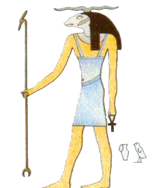 خنوم Chnum ... في الدين المصري القديم إله كان يصور على شكل كبش، أو رجل له رأس كبش وله قرنان (ربما اشتق اسم الغنم منه أو العكس مع بعض التحريف ) . طبقا للمعتقد المصري القديم قام خنوم بعملية الخلق المادي للإنسان من طمي النيل على عجلة الفخار .