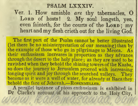 استكمالاً للموضوع : و اليوم بعد أن قدمنا بعدد من المراجع و بطرق شتى أن وادي البكاء هو اسم لمكان حقيقي ..... و لكن لا أحد يعرف أين يقع وادي البكاء .... بدأنا في البحث عن الكلمة داخل دفتي الكتاب المقدس ، و اقتبسنا جزء من سفر صموئيل الثاني الاصحاح الخامس ، العدد 23 ..... لنرى هل بكة مكان خيالي ، هل هي صحراء أو مكان زراعي ، هل بها جبال و قمم ، هل كان الأنبياء يعرفونها جيداً أم كانت مجهولة ؟؟؟؟؟؟؟؟؟؟؟؟؟؟ . فَسَأَلَ دَاوُدُ مِنَ الرَّبِّ فَقَالَ: «لاَ تَصْعَدْ، بَلْ دُرْ مِنْ وَرَائِهِمْ وَهَلُمَّ عَلَيْهِمْ مُقَابِلَ أَشْجَارِ الْبُكَا 24. وَعِنْدَمَا تَسْمَعُ صَوْتَ خَطَوَاتٍ فِي رُؤُوسِ أَشْجَارِ الْبُكَا حِينَئِذٍ احْتَرِصْ، لأَنَّهُ إِذْ ذَاكَ يَخْرُجُ الرَّبُّ أَمَامَكَ لِضَرْبِ مَحَلَّةِ الْفِلِسْطِينِيِّينَ». 25. فَفَعَلَ دَاوُدُ كَذَلِكَ كَمَا أَمَرَهُ الرَّبُّ، وَضَرَبَ الْفِلِسْطِينِيِّينَ مِنْ جَبْعٍَ إِلَى مَدْخَلِ جَازَرَ. و نحن لا نعلم هل من يقرأ هذا الكلام يفهم ما يقرأ .... و لكن مفسري الكتاب المقدس سوف يساعدوننا في فك هذا الطلسم : "لاحظ عمل الله فهو يرشد داود عن الخطة الحربية. أشجار البكا: أشجار يتساقط منها عصير يشبه الدموع. صوت خطوات: صوت خطوات عسكرية منتظمة فى رؤوس أشجار البكا: هو صوت ريح فى رؤوس الأشجار. فالله أجرى ريحاً سببت صوت يشبه وقع أقدام جيش ليرعب الفلسطينيين. فنفس الصوت الذى طمأن داود أن الله معهُ أرعب أعداء داود. ونحن علينا ان نجاهد كما حارب داود فى وادى البكاء أى هذا العالم أى نندم على خطايانا ونبكى عليها والله يرعب أعدائنا الشياطين. من جبع إلى مدخل جازر: أى أن الفلسطينيين بعد أن إنكسروا لجأوا فى هروبهم إلى جبع فتابعهم داود فهربوا إلى مدخل جازر وهم منكسرين. مادة صمغية لها رائحة عطرية. + المهم أن نعلم أن الله أمامنا فى حروبنا الروحية فلنتشدد. " لم قدم لنا أنطونيوس فكري ، مفسر الكتاب المقدس تفسيراً واضحاً لما حدث ..... و لكن علينا أن نسأل المفسر لماذا لم يخبرنا أين يقع وادي البكاء ، و أشجار البكاء هذه ؟؟؟؟ و هل كان للأشجار رؤوس و على داود عليه السلام أن يسمع صوت الجيش القادم من رؤوس الأشجار ؟؟؟؟ ما هذا ؟؟؟؟ من الذي أتكلم به هذا !! أتعجب لهؤلاء يقول تادرس يعقول " نزل داود ورجاله إلى وادي الدموع لكي يتقبل نعمة الله المجانية أكثر فأكثر، فينطلق من قوة إلى قوة، إذ ضرب الأعداء من جبْع إلى مدخل جازَر [٢٥]. في وادي الدموع انفتحت بصيرته ليرى الله يتقدمه ممهدًا له طريق النصرة، ومحطمًا العدو أمامه. وكأن الحضرة الإلهية التي تملأنا تعزية وسط الدموع، ترعب العدو وتحطمه تمامًا. " طبعاً هذا كله هذيان و تخبط ، لقد ترك اليهود كتبهم للبغبغاوات و المتحزلقين ، يكتبوا ما يريدون و لا يعرفون ما يكتبون ، فلقد أجمع جل علماء المسيحية أن الوادي مجهول ، و أنه مكان غير حقيقي ، بل مجازي ، فهل كان داود النبي يحارب في مكان مجازي ، أم كان يحارب في السماء و ليس على الأرض ؟؟؟ ثم يتقدم أحدهم ليعلن أن بكة بكل تأكيد ليس هي مكة التي يتحدث عنها المسلمين ، فداوود لم يكن يوماً موجوداً في بكة ( مكة ) أو حارب فيها ...... سؤال منطقي و لكن هل تملك أنت يا من توجه لنا السؤال أن تثبت العكس ؟؟؟ أن تثبت أن داوود لم يذهب يوماً إلى بكة (مكة) ؟؟؟؟؟ هل لديك دليل على ما تقول ؟؟؟؟؟ هل تعلم أن كل علمائك لا يعلمون أين وادي البكاء !! فكيف تتجرأ و تقول أنه لم يذهب إلى بكة ..... هل تعلم أين الوادي ، لا تعلم فمن أخبرك أن الوادي بكل حال من الأحوال لا يوجد في مكة المكرمة ؟؟؟؟؟؟؟؟؟؟؟؟؟؟؟؟؟؟؟؟ قبل أن تجيب على هذا السؤال أقرأ هذا التوضيح البسيط الذي قدمته لعله يكون دليلاً لك . ..... : نعلم جيداً أن وادي بكا أو وادي بكة ..... تم ترجمته لمعنى البكاء ، لكي يتملص هؤلاء من كشف المكان لأنه بركة الله سوف ينالها البشر فيه ، ثم قالوا مكان خيالي و مجازي حتى لا يتجرأ أحد فيقول أين ذلك المكان حتى أذهب إليه و أتبرك فيه و اطلب البركة من الله .... لقد أغلق العلماء كل ال