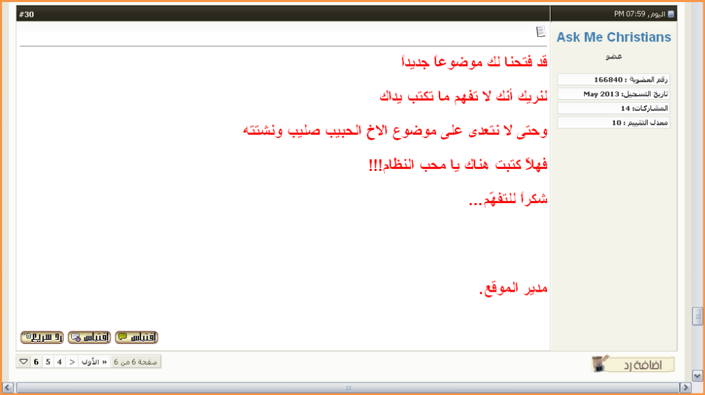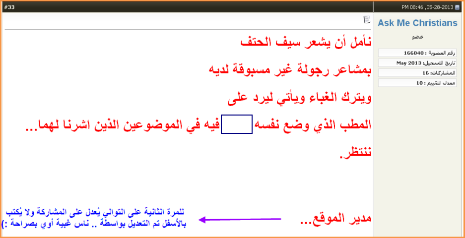 بعد ما الواد المسيحي إتاخد غسيل ومكواة وبقى مش عارف يُرد عليا ولغاية دلوقتي مشاركة كاملة لم يرد عليها ، قام المدير داخل وعامل نفسه بينظم الحوار وهو بيحاول يحافظ على ماء وجه مراقبه العام بعد آخر مشاركة ليا معاه اللي أخدته فيها غسيل ومكواة .. وعايزكوا تركزوا في الحاجات اللي معلّم عليها وعامل عليها أسهم عشان الفضيحة جااااااااااااية دلوقتي حالاً :)