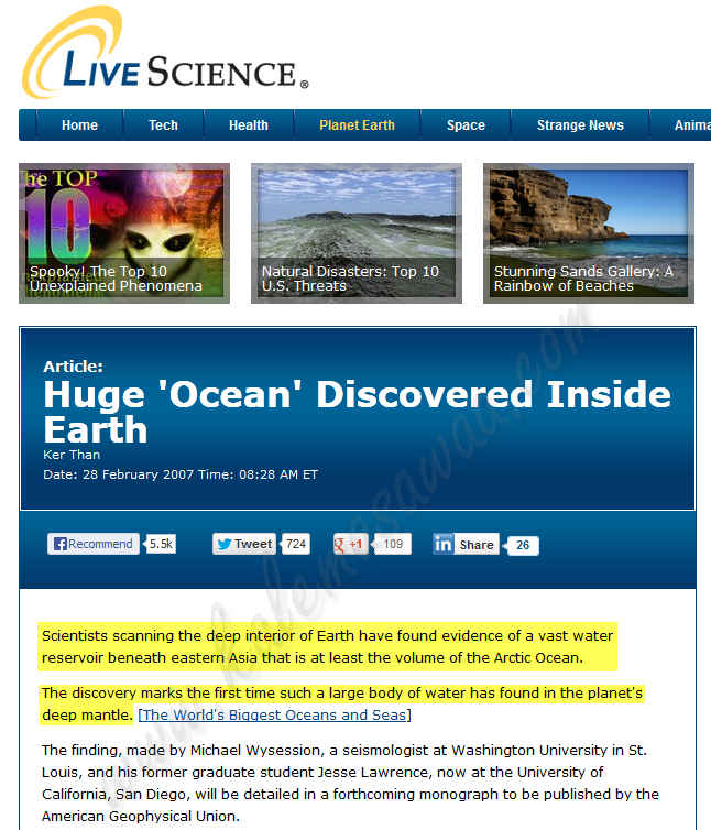 http://library.islamweb.net/newlibra...no=67&ayano=30 ولم تكن آلات الحفر والضخ والسحب أو غيرها موجودة في ذلك الوقت .. وبالتالي فإن وجود الماء على أعماق قريبة - لن يتبخر فيها - كان سيعجز قريش __________________ ثانيًا: الماء يوجد في أعماق الأرض في طبقة الـ lower mantle (الوشاح السفلي) ولم يتبخر ![]() من موقع livescience.com الترجمة باختصار: اكتشاف ماء بحجم محيط في طبقة الوشاح السفلي _____________ من موقع National Geographic http://news.nationalgeographic.com/n...erworld_2.html الترجمة باختصار: فريق بحث ياباني قام بعمل تجارب توصل بعدها لإمكانية وجود ماء في طبقة الـ mantle _______________________ ثالثًا: كعادة شبهات النصارى والملحدين .. تتحول لإعجاز فقد اكتشف علماء الجيولوجيا وجود دورة مياه بين الماء الموجود في طبقة الـ mantle (الوشاح) (ماء غائر) ومياه المحيطات (ماء معين)، تسمى دورة المياه العميقة الحديثة حيث يتحرك الماء مع حركة الماجما من طبقة الوشاح إلى المحيطات ، ويهبط مع الإندساس من المحيطات إلى طبقة الوشاح http://www.physicstoday.org/resource...sAuthorized=no البحث كامل في المرفقات ____________ مصدر آخر:
