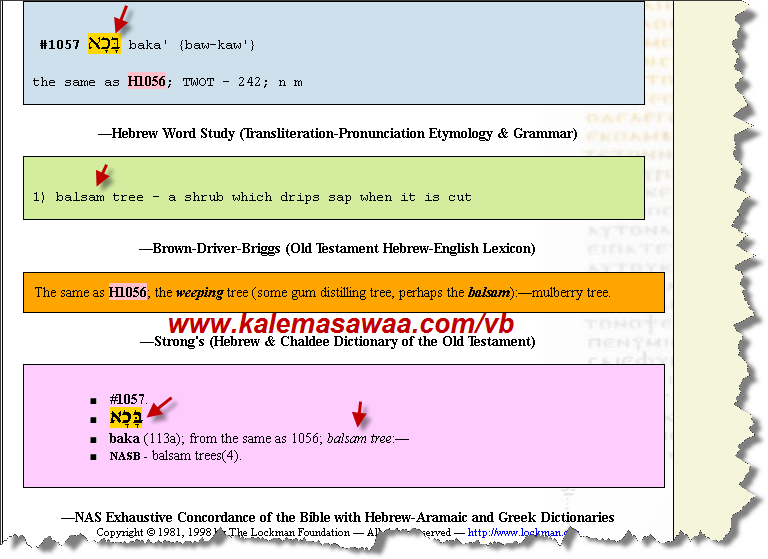 بسم الله الرحمن الرحيم.. السبب الذي يجعلني أعتقد أن القرائة الصحيحة هي "بكه" "בכה"، لأنها تطابق الإسم الثاني لمكة الذي هو "بكة"، أما عند إنتهائها بالألف "بكا" "בכא"، ستكون قرائتها مختلفة بعض الشيئ، ولذلك نرى القمص بسيط إستغل ذلك. وللعلم ليست السبعينية فقط التي ترجمتها إلى البكاء أو الدموع، بل حتى الفولجاتا، وترجوم يوناثان إذ ربط الإسم بالينابيع، وكذلك البيشطا، تقول "ܕܒܟܬܐ" دبكتا. المزيد من مواضيعي