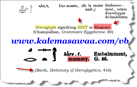لاتوجد كلمة فرعونية واحدة بهذا اللفظ : مسيح أو المسيح ،، حتى لو فرضنا جدلا أن أوزوريس كان يطلق عليه إسم "كرست" فمفيش- على حدّ علمي - دليل إن معناها : ممسوح ( مسيح ) . معنى KRST عند الفراعنة : KRST عند الفراعنة تعني مومياء المصدر : Grammaire égyptienne,Champollion, 1836 ![]() https://archive.org/stream/Grammaire.../n119/mode/1up دليل آخر على أنّ KRST = مومياء ![]() نطق كلمة الممسوح عند الفراعنة : "مسو" ![]() المزيد من مواضيعي