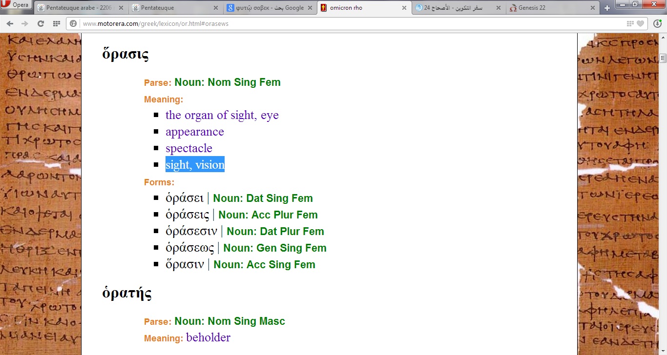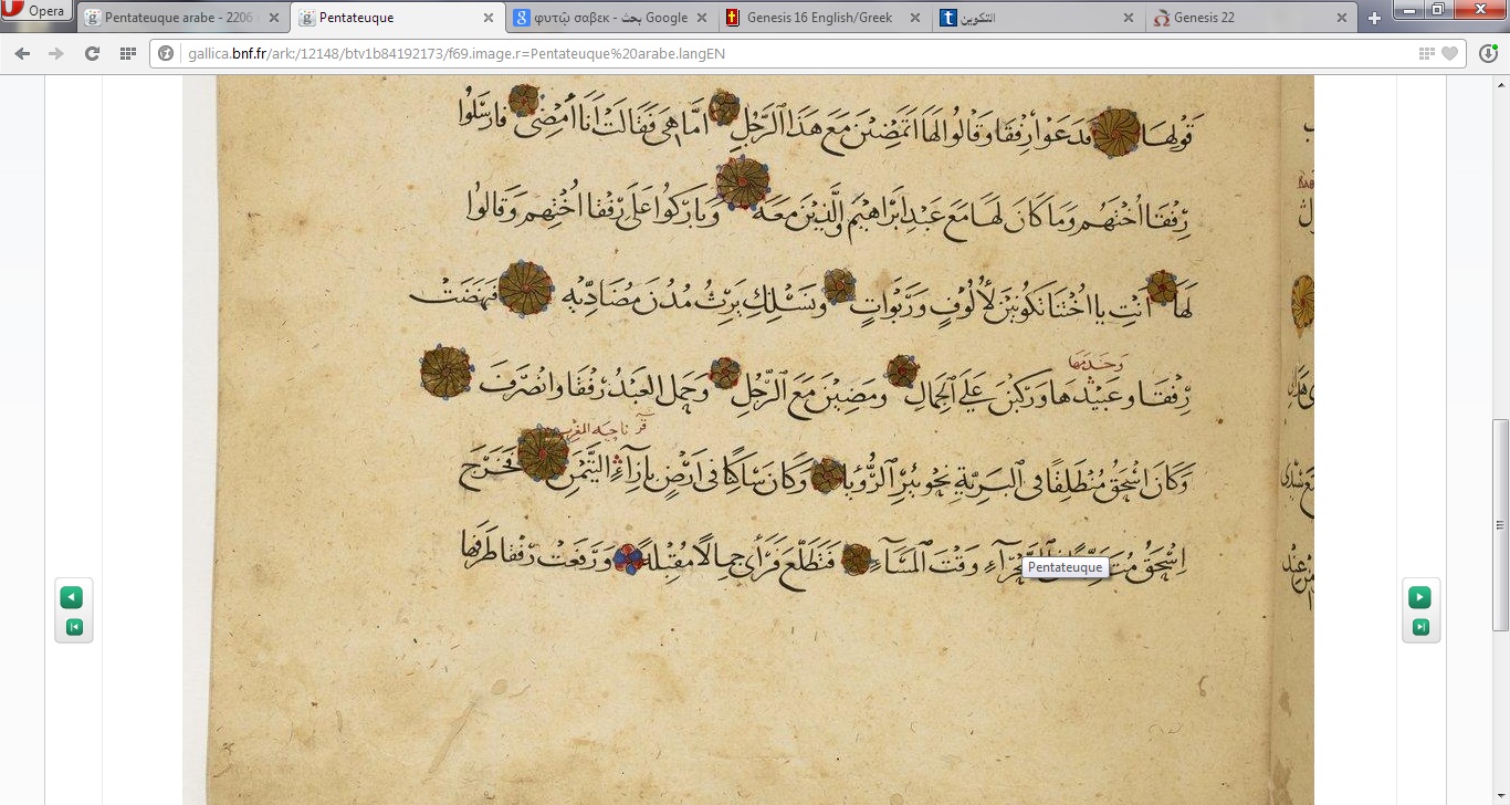 و قد أتيت من أجل عيون الدكتور عبد الرحمن و بحثت كثيرا حتى وجدت " بئر الرؤيا " و هي التي هي في الاساس مترجمة من كلمة " مسا " حيث انه من ضمن معانيها كلمة ... رؤيا . في نسخة للتوراة قديمة تعود إلى عام 1353 م ، مكتوبة باللغة العربية ، موجودة على موقع Gallica و هو موقع مكتبة فرنسا الوطنية ، الكتاب متاح للجميع ، ذكر فيه في الاصحاح 24 - 62 ما يلي : • 62. وكان إسحق مقيما بأرض النقب جنوبا. وبينما هو راجع من طريق بئر الحي الرائي، • 63. حيث خرج يتمشى في البرية عند المساء، رفع عينيه ونظر فرأى جمالا مقبلة نحوه. ترجمة الاخبار السارة .................................................. . • 61. وقامت رفقة وجواريها فركبن الجمال ومضين مع الرجل، وأخذ الخادم رفقة ومضى. • 62. وكان إسحق قد رجع من بئر الحي الراءي، وكان مقيما بأرض النقب. ترجمة اليسوعية .................................................. . الكلمة في اليونانية ὁράσεως و تعني يرى أو رؤيا أو مشهد ، و بذلك هي ترجمة لكلمة " مسا " العبرية و التي أوردنا أنه من ضمن معانيها " رؤيا " . موقع الترجمة اليونانية : http://www.motorera.com/greek/lxx/genesis24.html أرفقت لكم بعض الصور التي تساعد من يريد الإطلاع و الاستفسار المزيد من مواضيعي
