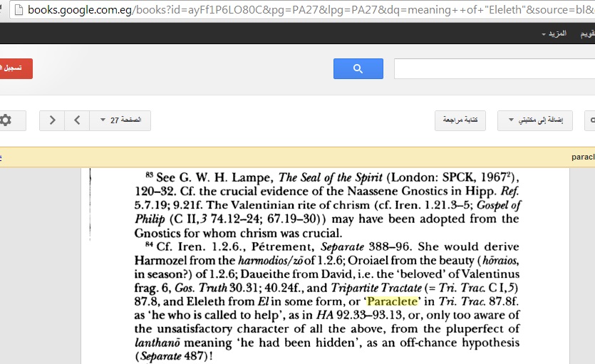 في كتاب نشراً في الآونة الأخيرة يسمى " Gnostic Truth and Christian Heresy " الإيمان الغنوصي و الهرطقات المسيحية .... كشف الرجل عن كلمة " Eleleth " التي سبق و أشرت لها و تكلمت عنها و هو النور الرابع الرباني الهادي الذي سوف يتوب على يديه كل البشر و هو آخر الأنوار - الأنبياء - من ذو العزم الهادين المبشرين ... ربط الرجل بين هذا الاسم و بين كلمة البارقليط في كتابه هذا ....... http://books.google.com.eg/books?id=...aclete&f=false و قد اضفت لكم هنا صورة من كتابه من الصفحة التي يتكلم فيها عن العلاقة بين الأليط و بين البارقليط ... مشيراً أن كلمة بارقليط ذكرت مرة أخرى في مخطوطات نجع حمادي و لكنهم ترجموها لكي يختفى اثر الكلمة المشار إليها حيث يتمجد هذا الاسم تمجيداً .. فهو الذي كان قبل الوجود و هو من تعجز الكلمات عن وصفه ... الحبيب المصطفى عليه السلام .... ذكرت الكلمة في The Tripartite Tractate أو الرسالة ذات الثلاثة أطراف .. - الرسالة المثلثة - سوف اقتبس لكم جزءاً منها من ترجمة و لكل من يقرأ الترجمة و يحاول التعديل فإهلا و سهلا به : It is impossible for anyone to conceive of him or think of him. Or can anyone approach there, toward the exalted one, toward the preexistent in the proper sense. But all the names conceived or spoken about him are presented in honor, as a trace of him, according to the ability of each one of those who glorify him……………………… Now he who arose from him when he stretched himself out for begetting and for knowledge on the part of the Totalities, …………… he [...] all of the names, without falsification, and he is, in the proper sense, the sole first one, the man of the Father, that is, the one whom I call لا يمكن لأى أحد ان يعبر عنه . أو أن يقترب هناك ناحية ذات الممجد ، يقترب من ذالك الذي قبل الوجود هو كائن . و لكن كل الأسماء (يقصد كل الأنبياء) التي تكلمت عنه قدمته في شرف ، و أنها نقطة في بحره ، كل ُ طبقا لمقدرته . ....... ................. فهو (.... سيتكلم ) عن كل الأسماء – الأنبياء – دون تزوير . و هو بالمعنى الحقيقي المتفرد ، و رجل الله ، أنه البارقليط (الشخص الذي ادعوه للمساعدة the one whom I call) . طبعا من الواضح أنهم ترجموا كلمة بارقليط إلى الشخص الذي يدافع أو يشفع أو يحامي عن ، فمهما يحاولون من تلفيق لن يطفؤا نور الله بأفواههم لأن الله متم نوره و لو كره الكافرون . و لولا خوفهم أن يكتشف العالم هذه الفضائح التي يخفونها و التي يدلسون من اجل ان يضل الناس عن الحقيقة و من أجل ان يظل يسوع مصلوباً من أجل البشرية لأنه الفداء الغير محدود يفعلون ذلك و لا ينشرون المخطوطات و لن يستطيعوا أن ينشرونها في يوم ما لأنها دليل نبوة محمد النبي الأمي عليه أفضل الصلاة و السلام ..... يقول كاتب انجيل برنابا " لكنه محمد الذي خلق الله روحه قبل خلقة العالم بستين ألف سنة ، ومن أجله خلق العالم كله .... " . و تقول مخطوطات نجع حمادي أكثر من ذلك ... في نفس المخطوطة السابقة نقرأ the form of the formless, the body of the bodiless, the face of the invisible, the word of the unutterable, the mind of the inconceivable, the fountain which flowed from him, ……………………………………… ……………………………………… ……………………………………… All of them exist in the single one, as he clothes himself completely and by his single name he is never called. The Tripartite Tractate " هيئة لمن ليس له هيئة و الجسد لمن بلا جسد و الواجهة لمن ليس له واجهة و الكلمة التي لا يمكن وصفها و العقل الذي يمكن تصوره و ينبوع متدفق من عنده ( من عند الله يعني ) ................................................. ................................................. ................................................. كل هذا في شخصية واحدة ، متوافقة مع تلك الأوصاف معه تماماً و باسمه المفرد لن ينادي عليه أحداً أبداً ." فمحمد عليه الصلاة و السلام لا يذكر باسمه فهو أحمد والشفيع و طه و ياسين و النبي و غيرها من الاسماء التي هي اسماءه لذلك من الصعب أن يناديه أحد باسمه . و للحوار بقية المزيد من مواضيعي
