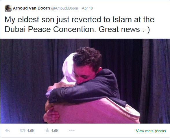 آمين .. بارك الله فيكم أخي الفاضل جعلكم الله دوما من السباقين في الخير أسلم إسكندر ابن فان دورن خلال فعاليات مؤتمر دبي العالمي للسلام ضمن 37 شخص أسلموا حيث ردد إسكندر الشهادتين https://twitter.com/ArnoudvDoorn/sta...10643393298432 ______________________ وفي لقاء مع جريدة الـ Khaleej Times أوضح إسكندر أسباب اعتناقه الإسلام http://www.khaleejtimes.com/kt-artic...=nationgeneral