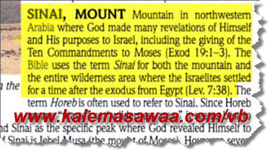 قاموس كتاب النّصارى المقدّس يحدّّد موقع سيناء كالآتي : Holman Illustrated Pocket Bible Dictionary صفحة رقم : 131 ![]() يقع جبل سيناء شمال غرب شبه الجزيرة العربية حيث أعلن الربّ عن نفسه مانحا النبي موسى الوصايا العشر . الكتاب المقدّس يستعمل مصطلح سيناء لكِلـَي الجبل و البرية التي مكث فيها العبرانيون مدّة من الزّمن بعد خروجهم من مصر . http://books.google.nl/books?id=gt44...ionary&f=false ![]() ![]() ![]() ![]()
