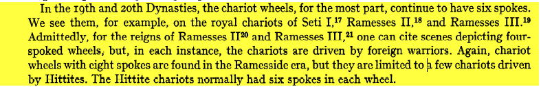 هناك مؤشّرات تُفيد بكون رمسيس الثاني هو فرعون الخروج ،، ماهو نوع العربات المستعملة في عهد رمسيس الثاني ؟؟؟ ![]() ![]() في الصورة أعلاه : James K. Hoffmeier عالم آثار ، أستاذ العهد القديم و التّاريخ بكلية الثالوث الذي يقول : ![]() http://www.michaelsheiser.com/PaleoB...eelinEgypt.pdf في عهد الأسرتين 19 و 20 العربات المستعملة في الغالب هي من نوع 6 أذرع ، كمثال نجد هذا النوع ضمن العربات الملكية لــ سيتي الآوّل ، رمسيس الثاني و رمسيس الثالث . خلال فترة حكم هذين الأخيرين استعملت عربات من نوع 4 أذرع يقودها مُحاربون أجانب*، في منطقة حكم آل رمسيس وجدت آثار لعربات قليلة من نوع 8 آذرع يقودها حثيون المعروف عن عرباتهم انها من نوع 6 أذرع . * الفراعنة كانو يستعينون في حروبهم بمرتزقة من سردينيا ، ليبيا ( The Qeheqs ) ، النّوبة . المزيد من مواضيعي
