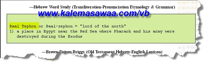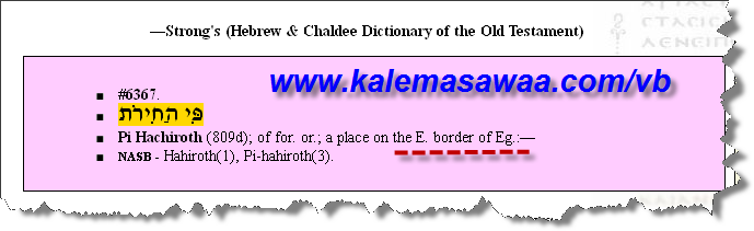لاشكّ أخي الحبيب ، كتاب النّصارى المقدس رغم التحريف و التبديل لازال يضم بين دفتيه - وخاصة العهد القديم - بعضا من الحقّ المُبين ! بخصوص فم الحيروث فيعرّفها لنا قاموس "سترونج " بنا هو آت: ![]() [ مكان على الحدود الشّرقية لمصر ] ![]() ![]() ![]() ![]() يعني العبرانيون توجّهوا في رحلة العبور شرقا - كما أخبر القرآن الكريم - لا جنوبا ! بخصوص بعل صفوان نقرأ : ![]() [ مكان بمصر قرب البحر الاحمر حيث هلك فرعون ومن معه ]
