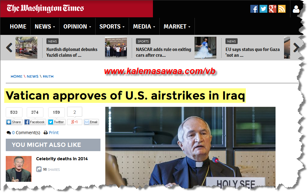 الوقائع على الأرض بعد تأييد الفاتيكان العلني لقرار الضربات الجوية بالعراق تقول :