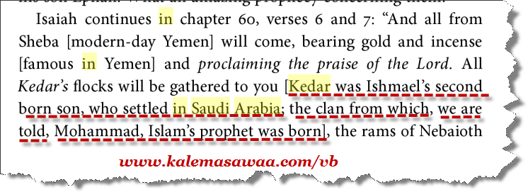 نقرأ من سفر إرميا 49 : 28وقالَ الرّبُّ على بَني قيدارَومَمالِكِ حاصورَالّتي قاتَلَها نبوخذنَصَّرُ مَلِكُ بابِلَ: «قوموا اصعَدوا إلى بَني قيدارَ ودَمِّروا أبناءَ المَشرِقِ 29خُذوا خيامَهُم وغنَمَهُم وستائِرَهُم وجميعَ أدواتِهِم وجِمالَهُم، ونادوا علَيهِم بِالرُّعْبِ مِنْ كُلِّ جهةٍ. إليكَ هذه القنبلة ! قيدار تقع في المملكة العربية السعودية كتاب : Exploring Bible Prophecy from Genesis to Revelation Tim F. LaHaye, Ed Hindson صفحة : 166 ![]() ![]() ![]() ![]()