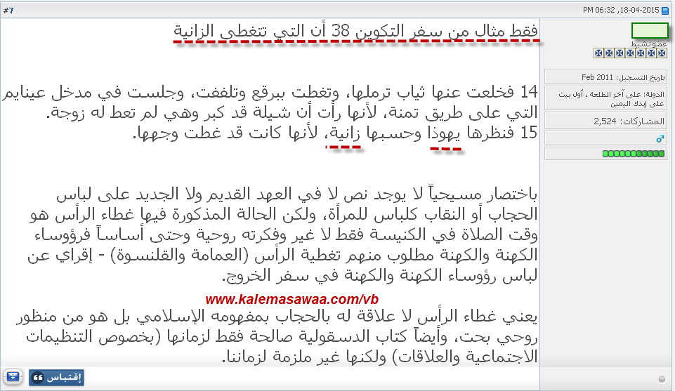 ![]() اللهم صل على محمد وعلى آله وصحبه أجمعين ـ هل ورد ذكر البرقع و النقاب في كتاب النصارى المقدس ؟؟؟ 1- البرقع ![]() http://st-takla.org/Full-Free-Coptic...2_B/B_096.html تكوين : 24 64- وَرَفَعَتْ رِفْقَةُ عَيْنَيْهَا فَرَأَتْ إِسْحَاقَ فَنَزَلَتْ عَنِ الْجَمَلِ. 65 - وَقَالَتْ لِلْعَبْدِ: «مَنْ هذَا الرَّجُلُ الْمَاشِي فِي الْحَقْلِ لِلِقَائِنَا؟» فَقَالَ الْعَبْدُ: «هُوَ سَيِّدِي». فَأَخَذَتِ الْبُرْقُعَ وَتَغَطَّتْ. تكوين 38 : 19 ثم قامت ومضت وخلعت عنها برقعها ولبست ثياب ترملها تتمة سفر دانيال 2 وَفِي الْغَدِ لَمَّا اجْتَمَعَ الشَّعْبُ إِلَى رَجُلِهَا يُويَاقِيمَ، أَتَى الشَّيْخَانِ مُضْمِرَيْنِ نِيَّةً أَثِيمَةً عَلَى سُوسَنَّةَ لِيُهْلِكَاهَا.29 وَقَالاَ أَمَامَ الشَّعْبِ أَرْسِلُوا إِلَى سُوسَنَّةَ ابْنَةِ حِلْقِيَّا الَّتِي هِيَ امْرَأَةُ يُويَاقِيمَ. فَأَرْسَلُوا.30 فَأَتَتْ هِيَ وَوَالِدَاهَا وَبَنُوهَا وَجَمِيعُ ذَوِي قَرَابَتِهَا.31 وَكَانَتْ سُوسَنَّةُ تَرِفَةً جِدًّا وَجَمِيلَةَ الْمَنْظَرِ.32 فَأَمَرَ هذَانِ الْفَاجِرَانِ أَنْ يُكْشَفَ وَجْهُهَا. وَكَانَتْ مُبَرْقَعَةً لِيَشْبَعَا مِنْ جَمَالِهَا.33 وَكَانَ أَهْلُهَا وَجَمِيعُ الَّذِينَ يَعْرِفُونَهَا يَبْكُونَ.34 فَقَامَ الشَّيْخَانِ فِي وَسْطِ الشَّعْبِ وَوَضَعَا أَيْدِيَهُمَا عَلَى رَأْسِهَا.35 فَرَفَعَتْ طَرْفَهَا إِلَى السَّمَاءِ وَهِيَ بَاكِيَةٌ لأَنَّ قَلْبَهَا كَانَ مُتَوَكِّلاً عَلَى الرَّبِّ. يُتبع ... للمزيد من مواضيعي