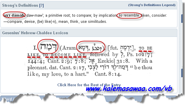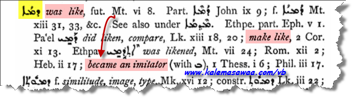 من المصدر ذاته الذي استشهدتَ به أخي الكريم [ 1 ]، ![]() معبود الكنيسة كان يتكلّم الأرامية ، و هي اللّغة ذاتها التي استعملها عندما صرخ طالبا العون و المدد من الآب ولكن ما من مُجيب [ 2 ] ! أسفله كلمتا "حقل " و "دما " كما وردتا في نص أعمال الرسل 1:19السّرياني - السريانية لهجة آرامية [ 3 ] - : ܘܗܝܼ ܗܵܕ݂ܹܐ ܐܸܬ݂ܝܲܕ݂ܥܲܬ݂ ܠܟ݂ܼܠܗܘܿܢ ܕ݁ܥܵܡܪܝܼܢ ܒ݁ܐܘܿܪܹܫܠܸܡ ܘܗܵܟ݂ܲܢܵܐ ܐܸܬ݂ܩܲܪܝܲܬ݂ ܩܪܝܼܬ݂ܵܐ ܗܵܝ ܒ݁ܠܸܫܵܢܹܗ ܕ݁ܲܐܬ݂ܪܵܐ ܚܩܲܠ ܕ݁ܡܵܐ[ 4 ] ܕ݁ܐܝܼܬ݂ܲܘܗ݈ܝ ܬ݁ܘܿܪܓ݁ܵܡܵܗ ܩܘܿܪܝܲܬ݂ ܕܸ݁ܡ وإليكم معنى كلمة ܕ݁ܡܵܐ "دما " [ 5 ] ![]() كما هو واضح أعلاه معنى كلمة ''دما'' يدور دائما في فلك الشّبيه و المثيل و المقلّد المتقمّص لدور" imitator" ---------------- المراجع : [ 1 ] http://www.blueletterbible.org/lang/...gs=H1819&t=KJV [ 2 ] إلوي إلوي لما شبقتني مرقس 15 : 34 [ 3 ] http://st-takla.org/Full-Free-Coptic...1_A/A_183.html [ 4 ] ܚܩܲܠ = حقل ܕ݁ܡܵܐ= دما [ 5 ] قاموس William Jennings المزيد من مواضيعي
